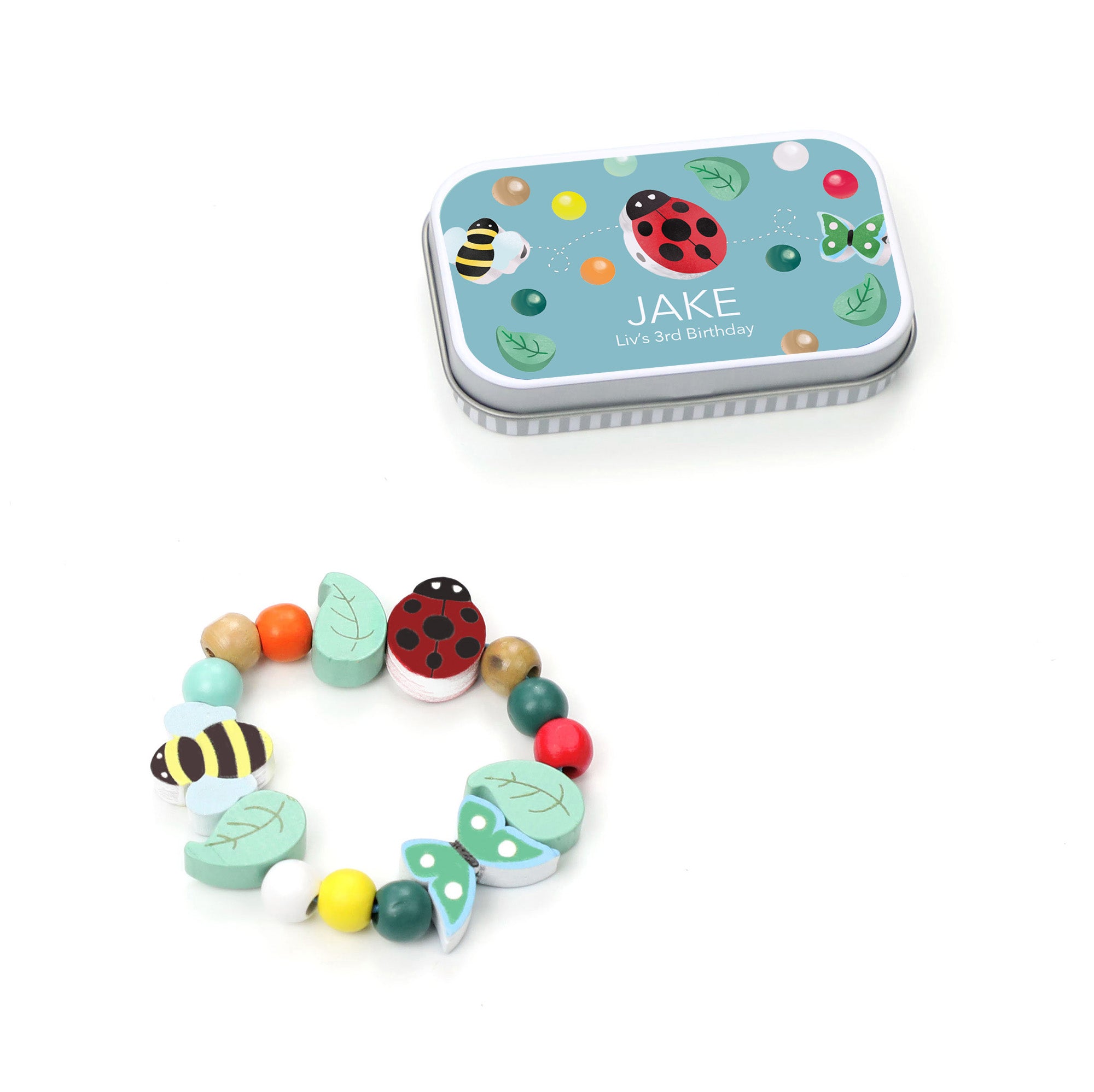 A personalised gift tin containing elastic & beads to create this minibeast bracelet. The elastic comes with hard ends to aid the beading process for young children. Then, patience & precision are all that's required to assemble this piece.