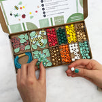 MATERIALS: Box, wooden minibeast beads, wooden leaf beads spherical wooden beads, 10 elastics with metal ends for easy threading, instruction card. UKCA/UKNI/CE tested