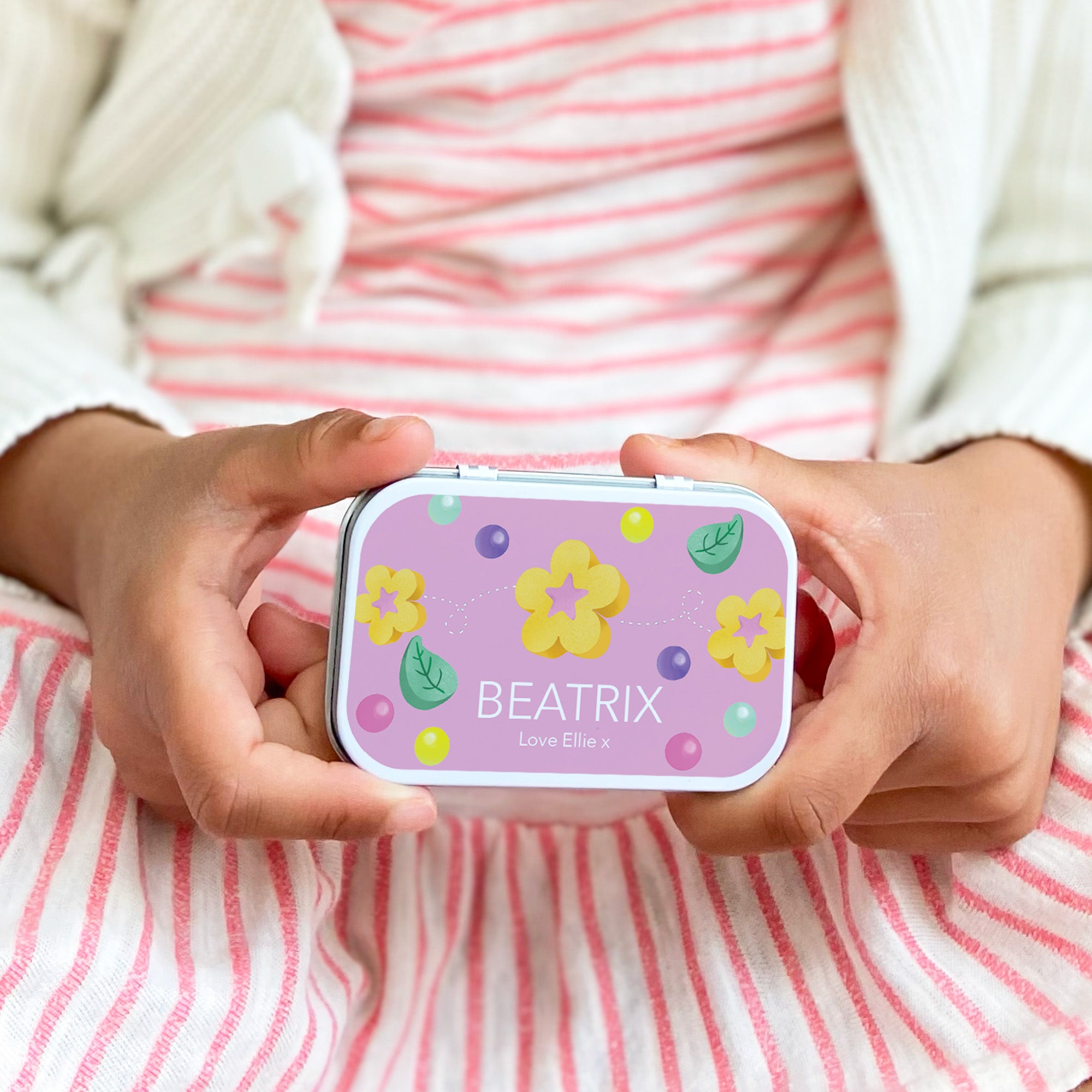 A beautiful personalised fairy bracelet gift tin containing elastic and beads to create this flowery fairy bracelet. The elastic comes with hard ends to aid the beading process for young children. Then, patience & precision are all that's required to assemble this piece.
