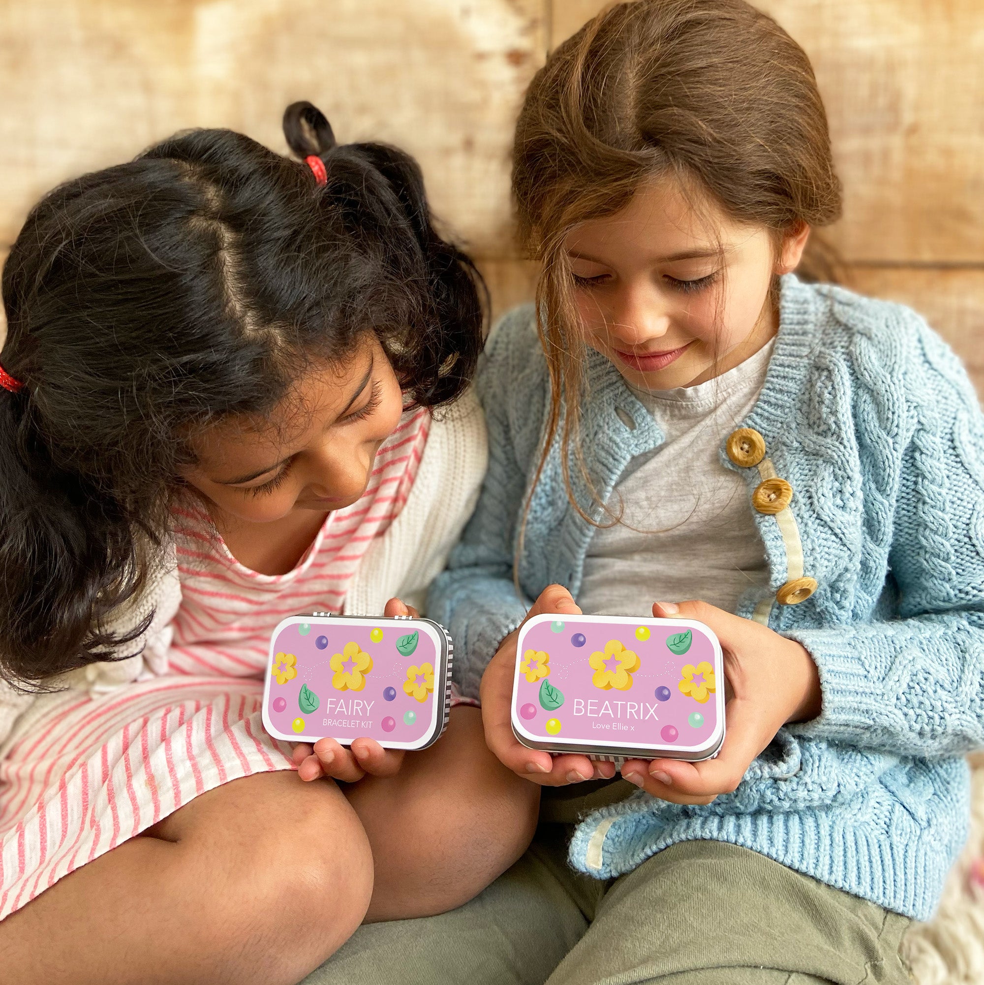 The fairy bracelet kit is presented in a rectangular tin, together with a personalised label to include the name of the recipient & a message.