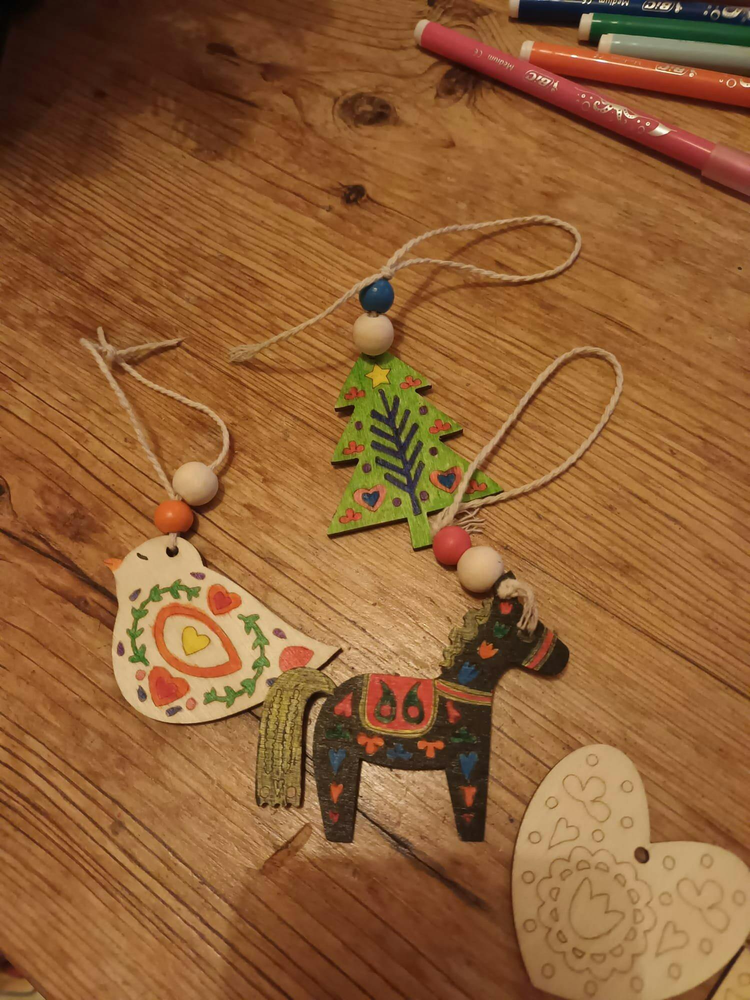 Along with the wooden decorations, the folk art decoration kit includes a selection of watercolour pencils and wooden beads, allowing for each decoration to be personalised with a touch of folk art charm.
