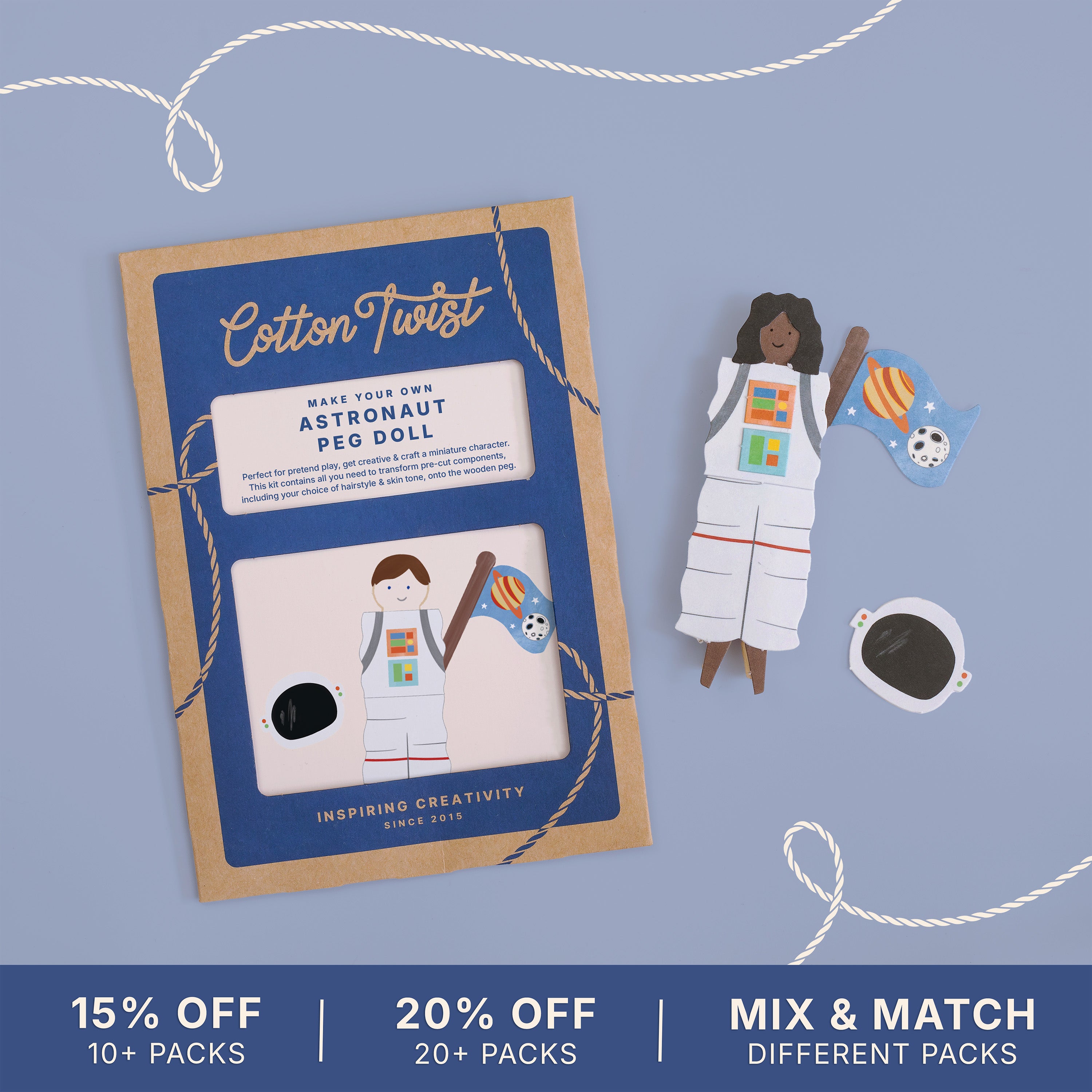 Children love to create, & this astronaut peg doll is fun to make & sparks imaginative play. Gently push the pre cut shapes out from the sheets, then choose the accessories you love the most. The astronaut comes with trousers, top, helmet, control panels & a backpack, together with a choice of skin tones & hairstyles for further personalisation. Stick the chosen items onto the peg with the glue dots provided to create your doll & enjoy the launch into outer space.