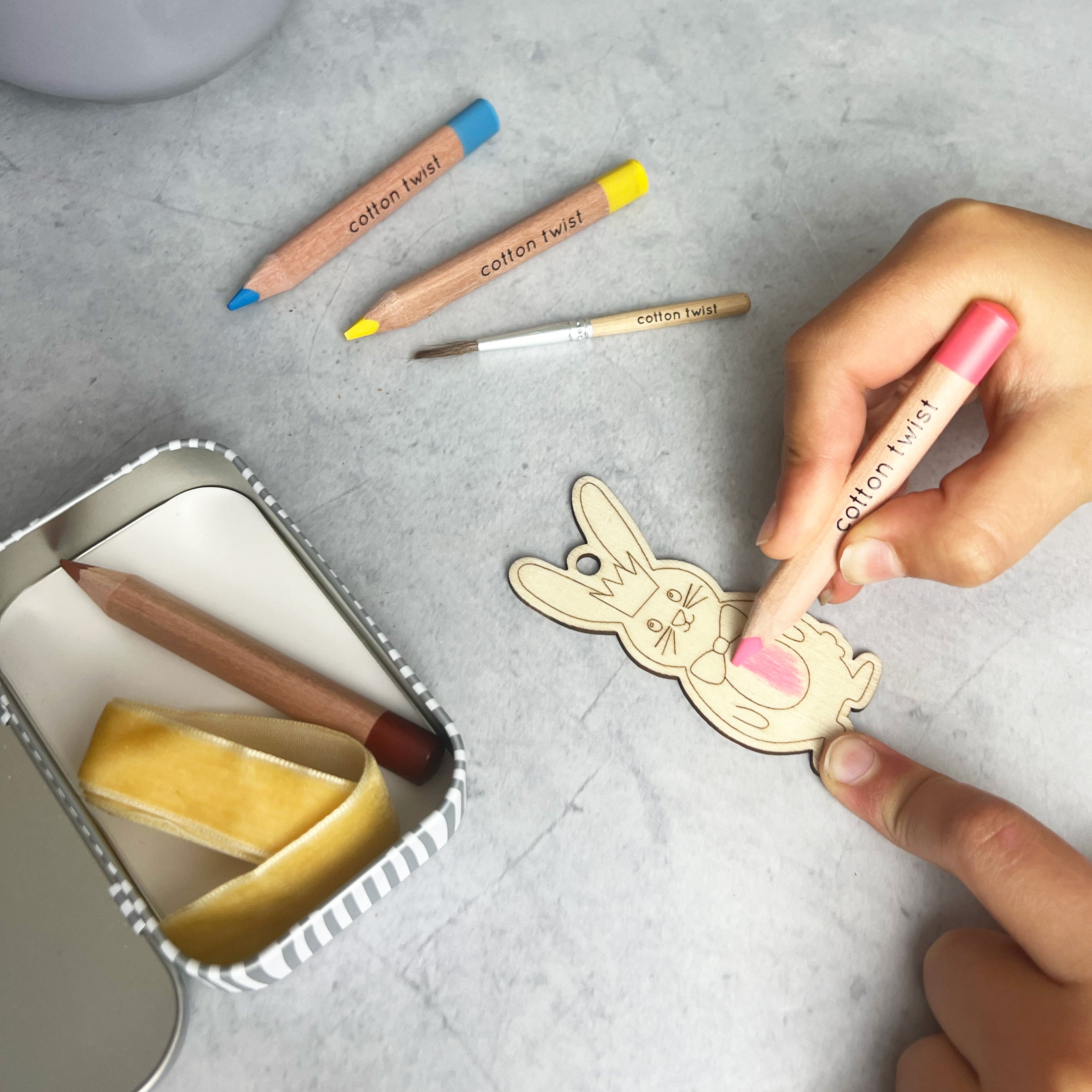 MATERIALS: Wooden bunny cut out, watercolour pencils, mini paintbrush, eco glitter glue, keepsake tin & label. UKCA/UKNI/CE tested
