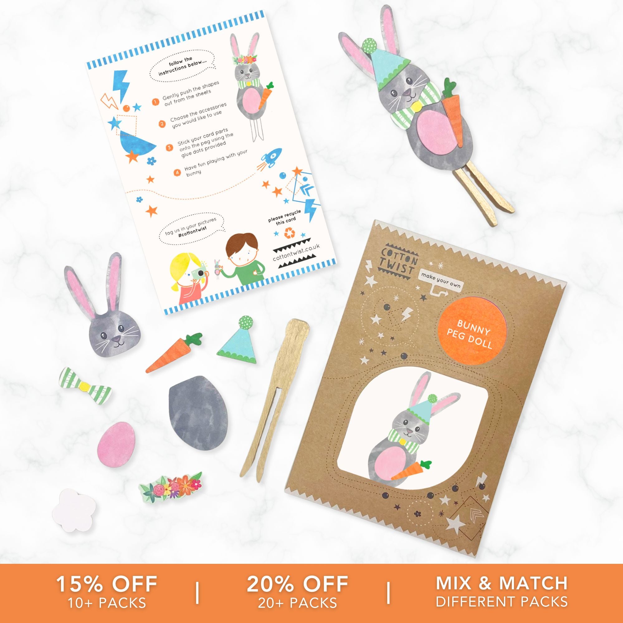 Children love to create, & this bunny peg doll is fun to make & sparks imaginative play. Gently push the pre cut shapes out from the sheets, then choose the accessories you love the most. The bunny comes with a body, head, tummy, bow tie, flower crown, party hat & carrot. Stick the chosen items onto the peg with the glue dots provided to create your doll & immerse yourselves in woodland fun.