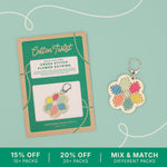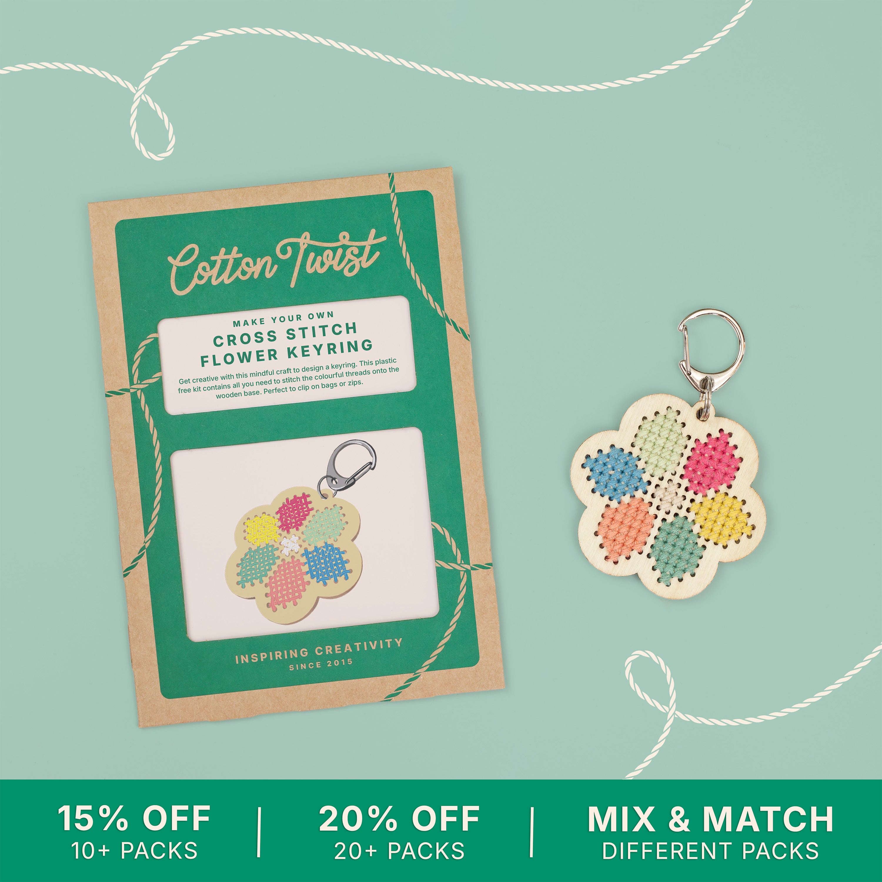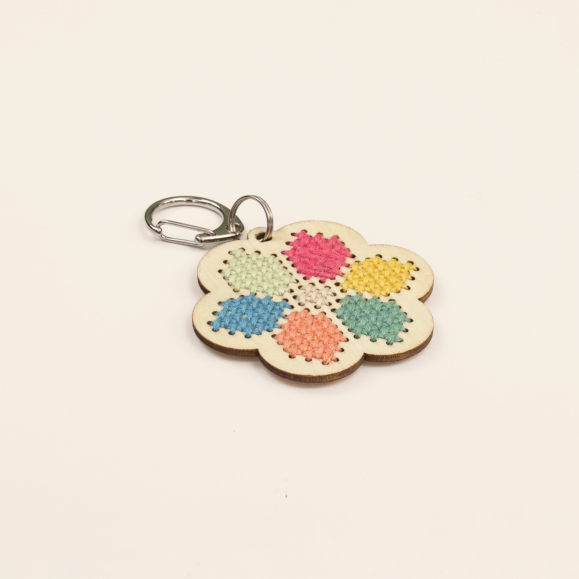 Introducing our Flower Cross Stitch Keyring kit! Inside each kit, you'll find a sturdy wooden flower ready to be stitched, a pack of pastel-coloured cotton threads and a durable metal embroidery needle.