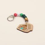 MATERIAL - wooden gingerbread house fob, spherical beads, keyring link, elastic with metal ends