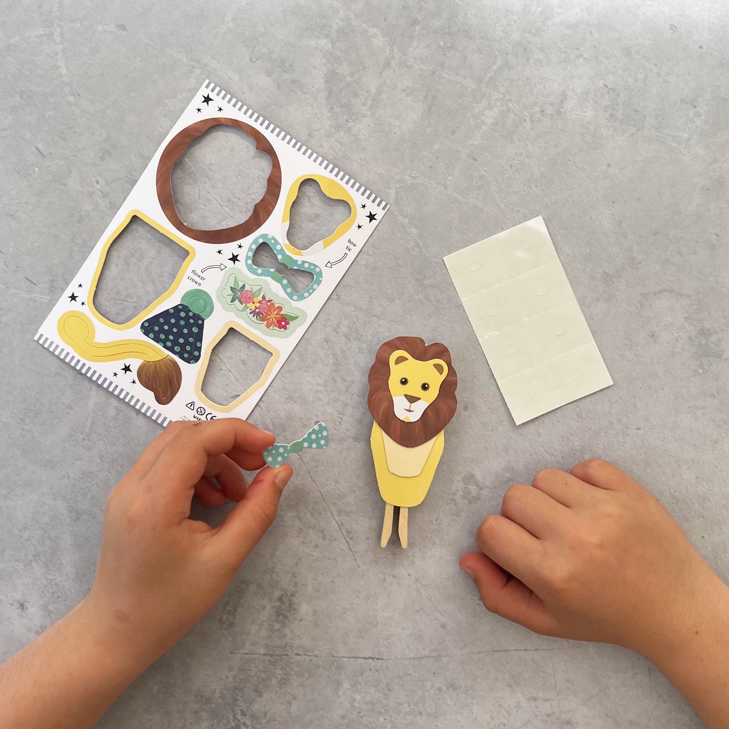 Children love to create, & this lion peg doll is fun to make & sparks imaginative play. Gently push the pre cut shapes out from the sheets, then choose the accessories you love the most. The lion comes with a body, head, tail, mane, bow tie, flower crown & a party hat. Stick the chosen items onto the peg with the glue dots provided to create your doll & immerse yourselves in safari fun.