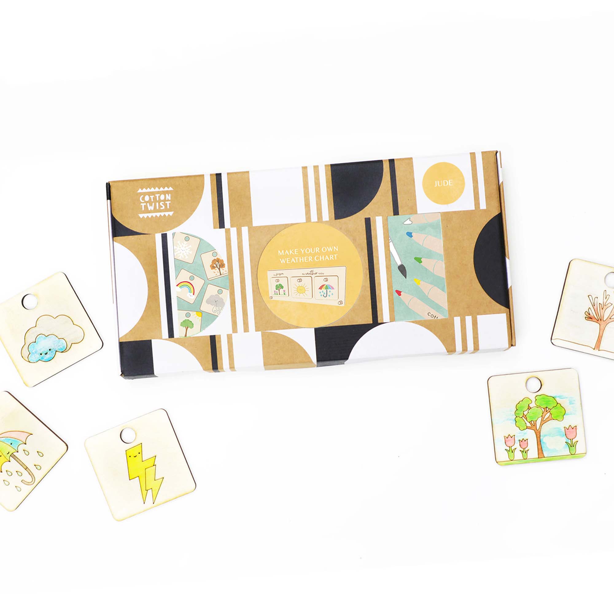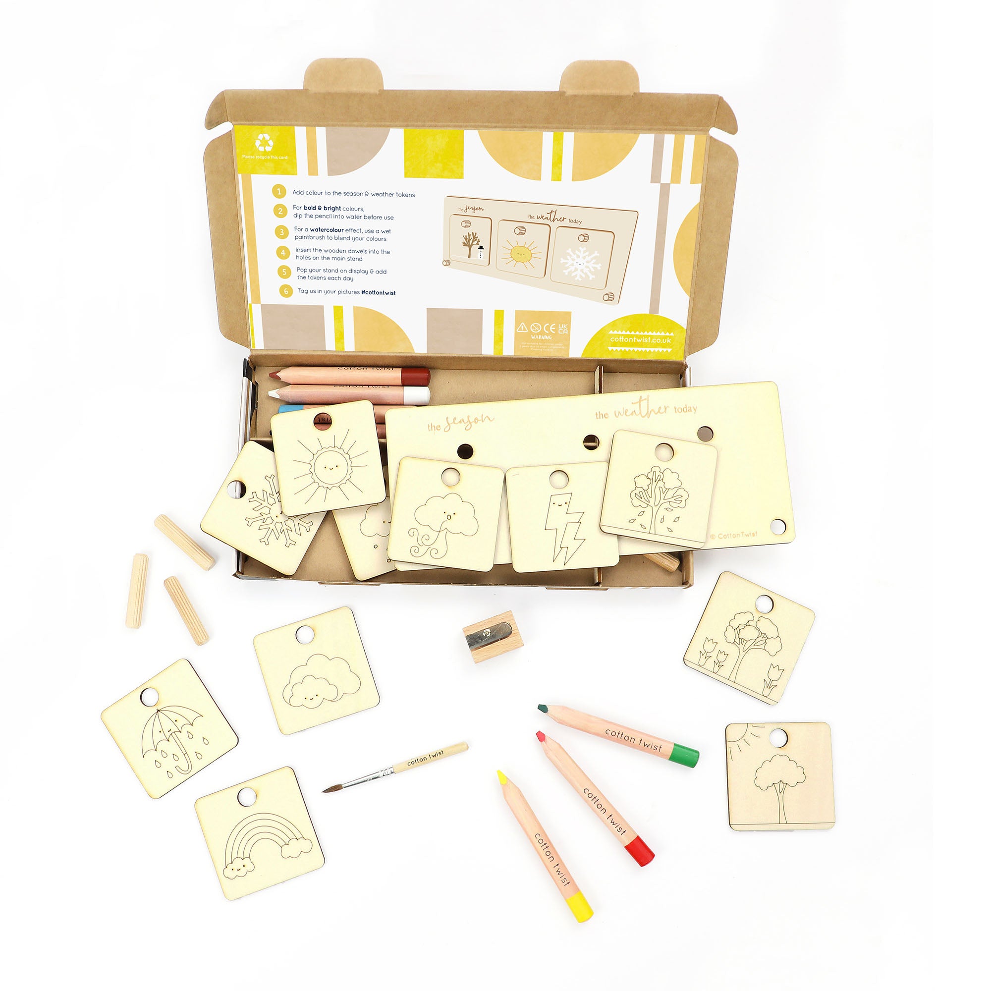 MATERIALS: Box, wooden stand, wooden dowels, 4 season wooden tokens, 8 weather tokens, 6 watercolour pencils, paintbrush, pencil sharpener, UKCA/UKNI/CE tested