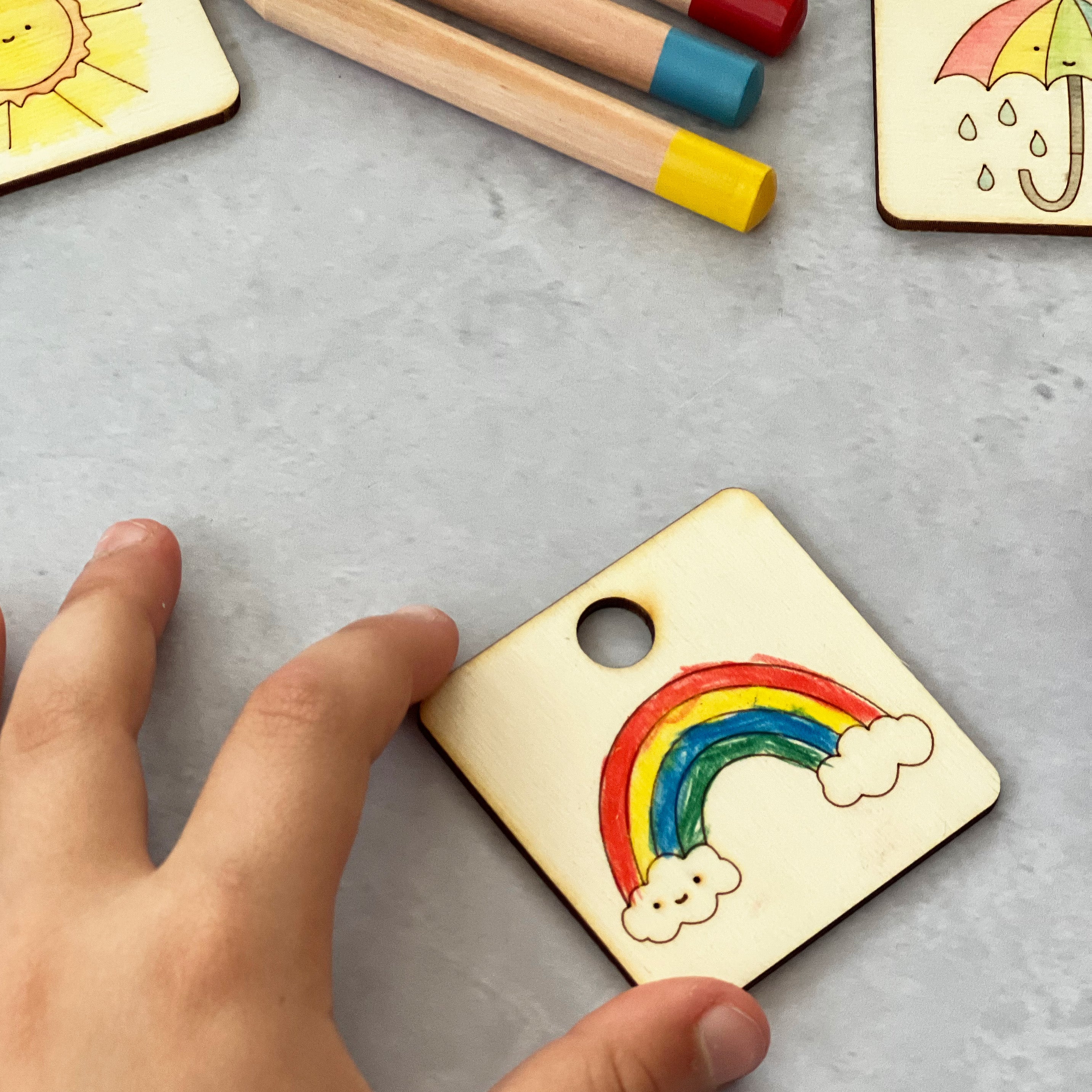Children can colour in their weather tokens using the watercolour pencils supplied in our make your own weather chart to create colourful images. Place your tokens on the stand to reflect the season and the day's weather.