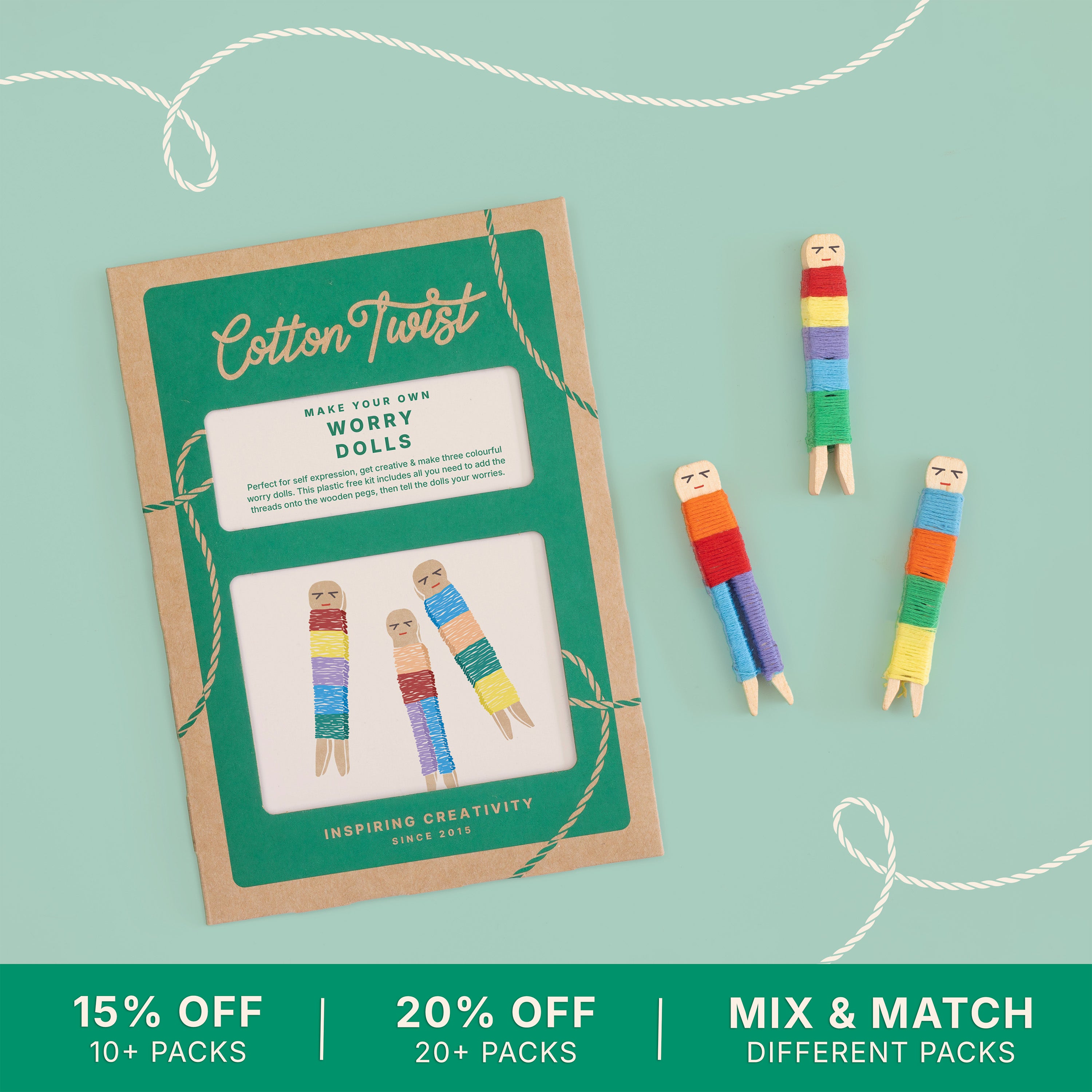 Perfect for three years & upwards, children will enjoy creating their own set of three miniature worry dolls with this sustainable craft kit. Cotton Twist craft activities are often gifted as party bags, birthday presents, stocking fillers or rainy day activities.