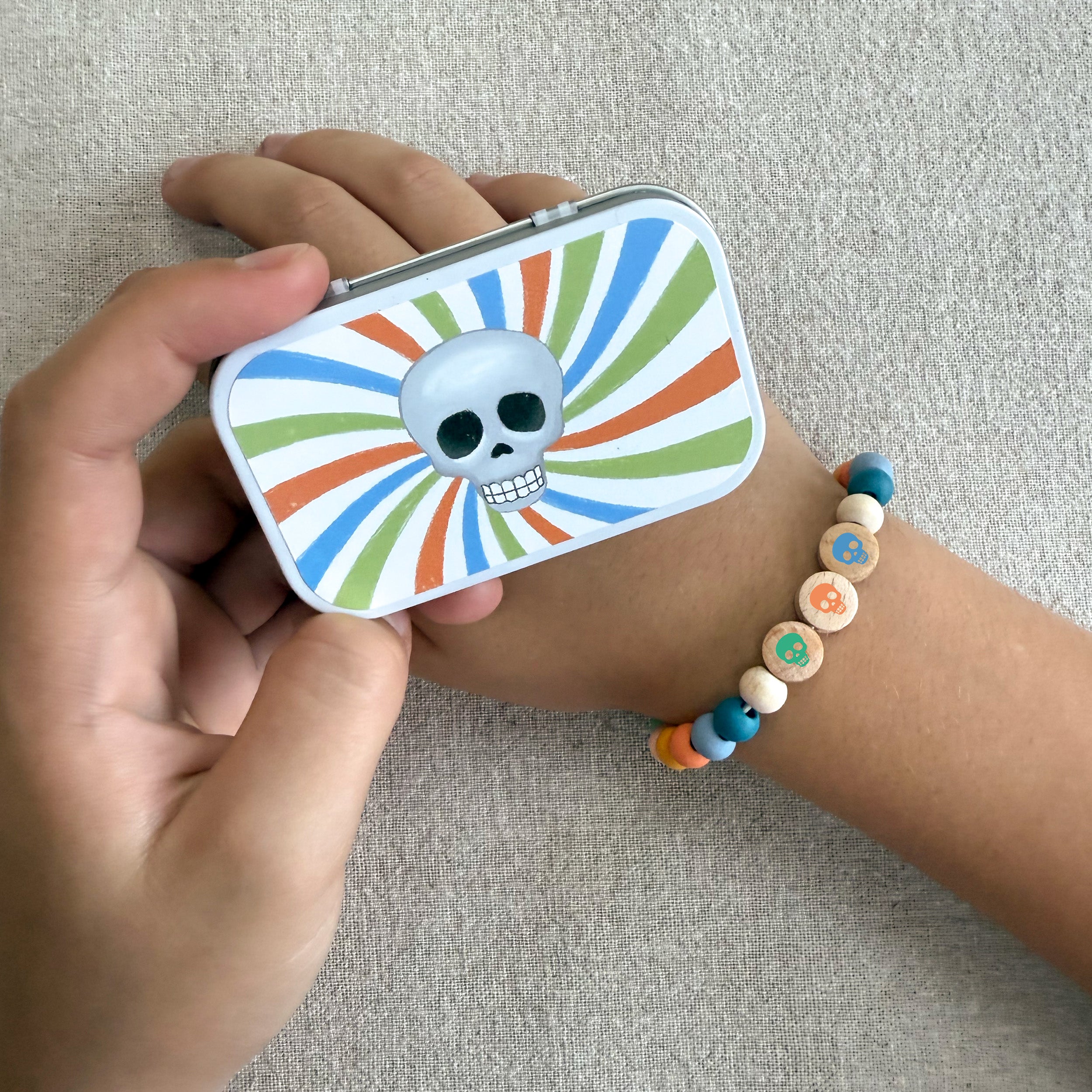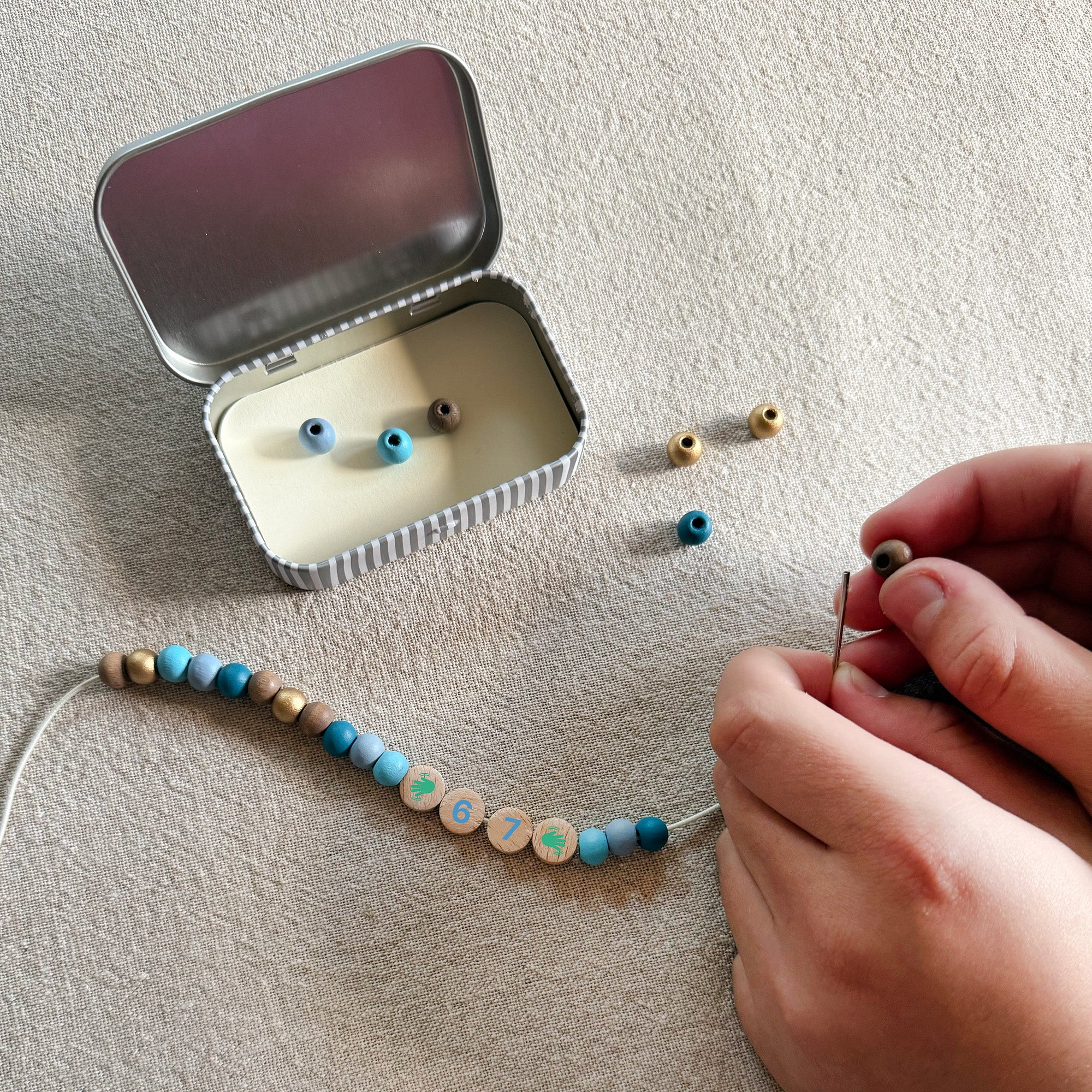 MATERIALS: Hinged tin, wooden letter beads, wooden spherical beads, elastic with metal ends to aid beading.