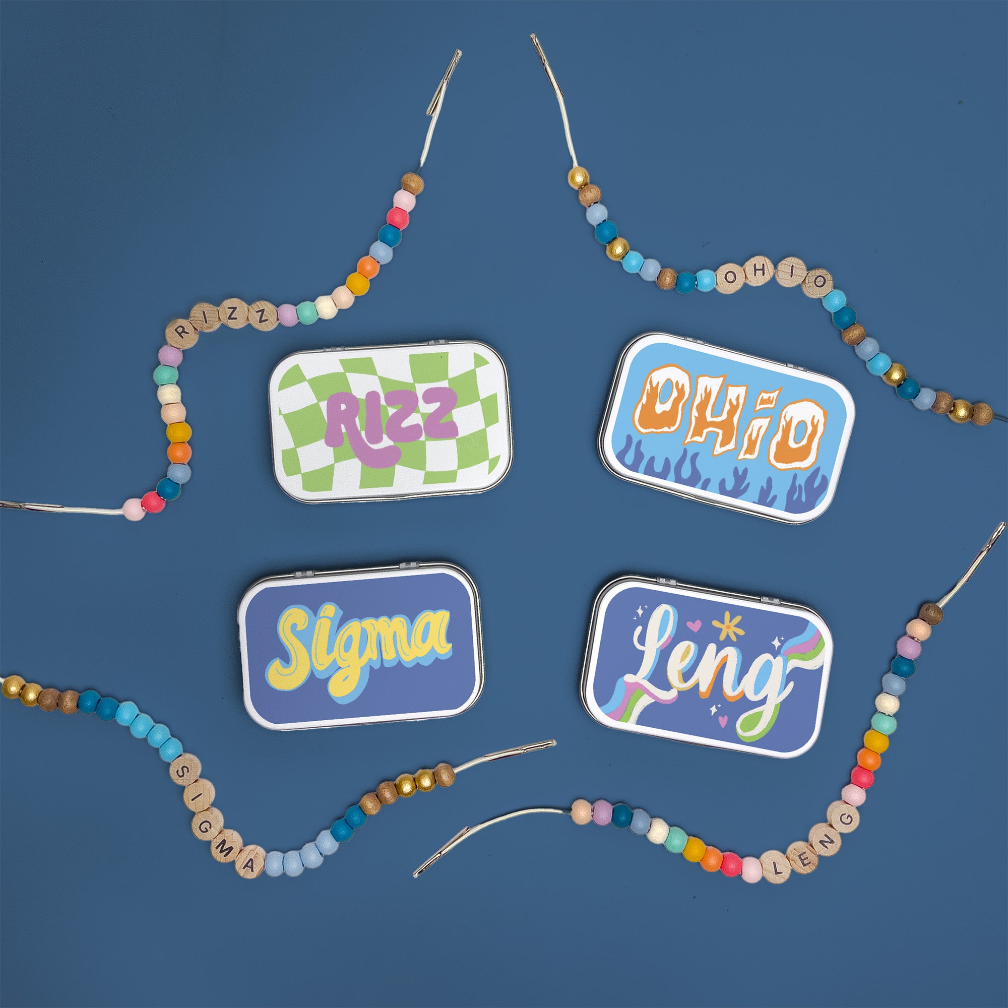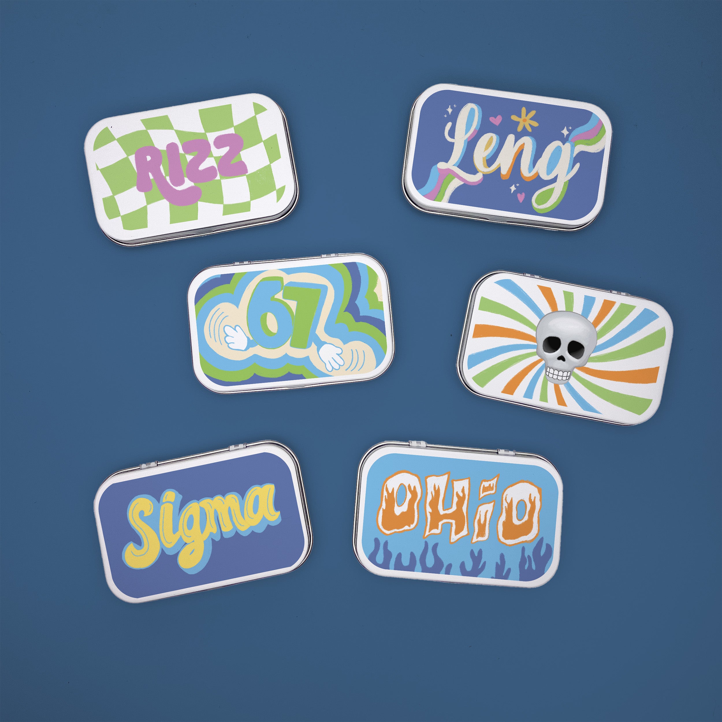 Bring the energy of Gen-Z slang to life with our collectible mini tins! Each tin features a bold, colourful design inspired by six slang words and symbols teens love most: Leng, Rizz, 6 7, Sigma, Ohio, and the iconic skull emoji.