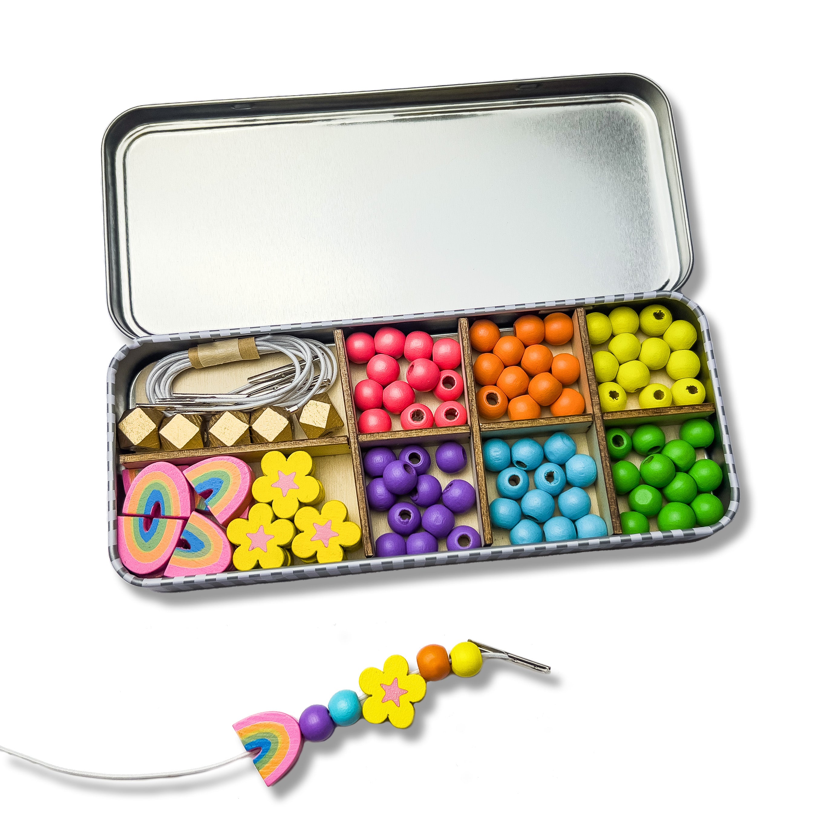 MATERIALS: tin, 8 wooden rainbow beads, 6 wooden flower beads, 5 gold geometric beads, 60 spherical wooden beads, 5 white elastics with metal ends for easy threading. UKCA/UKNI/CE tested