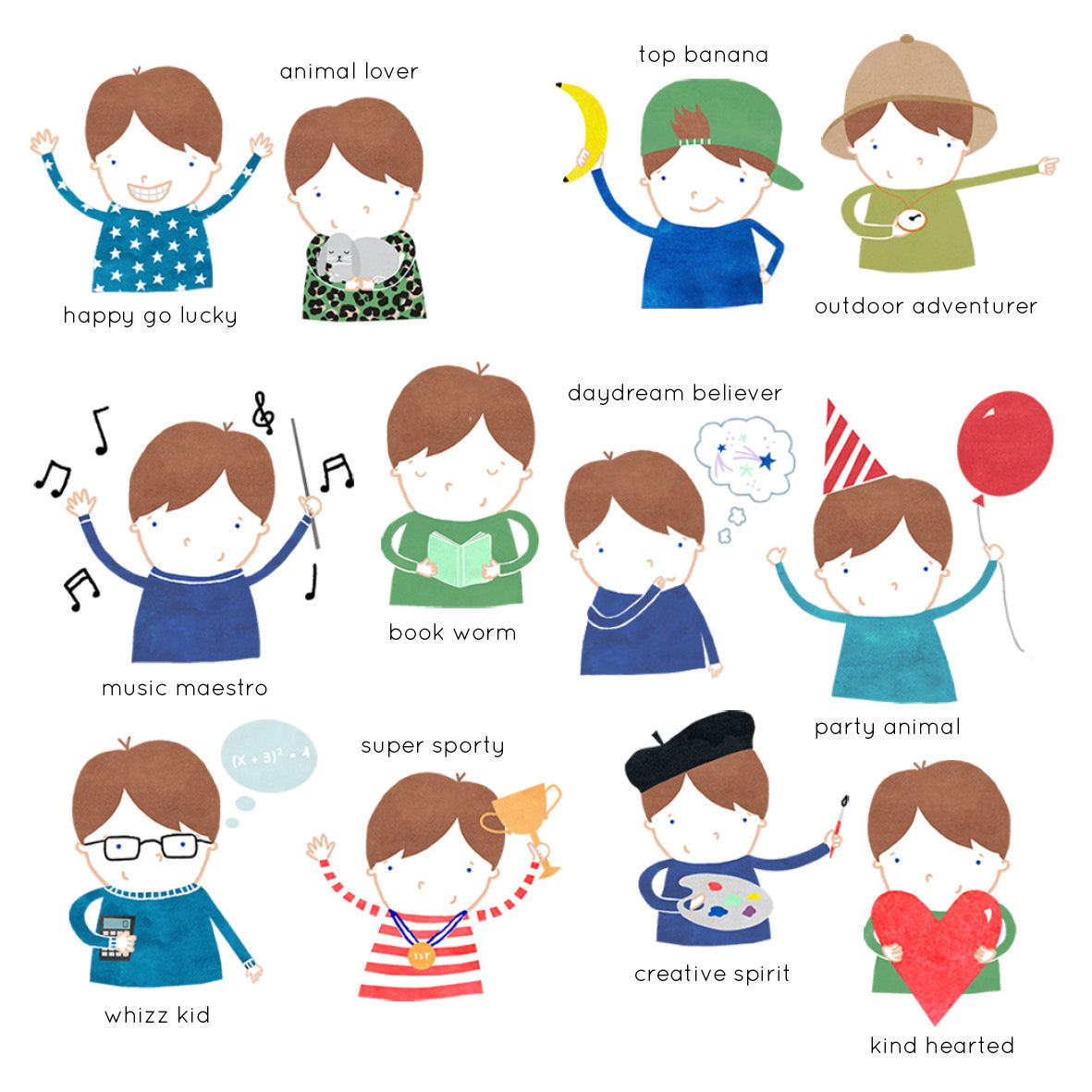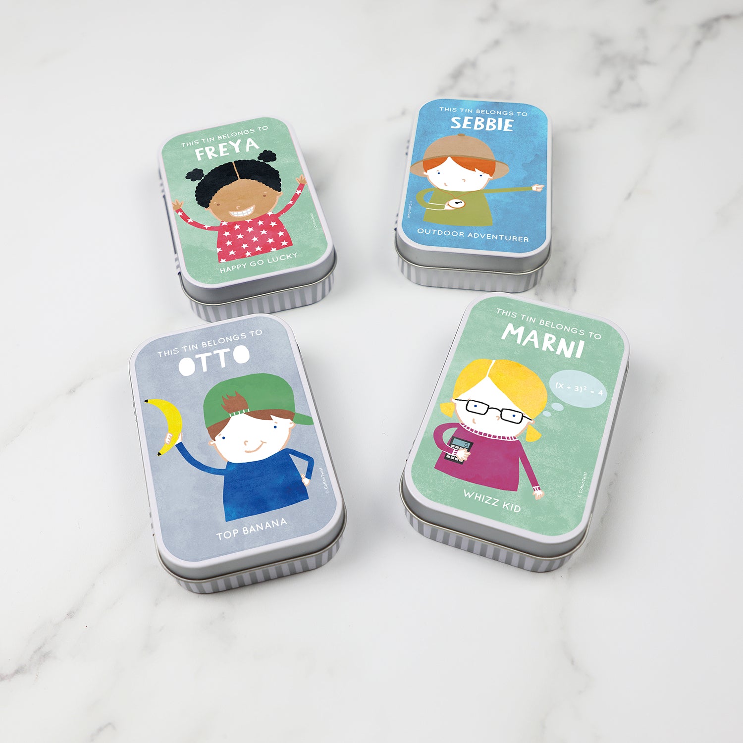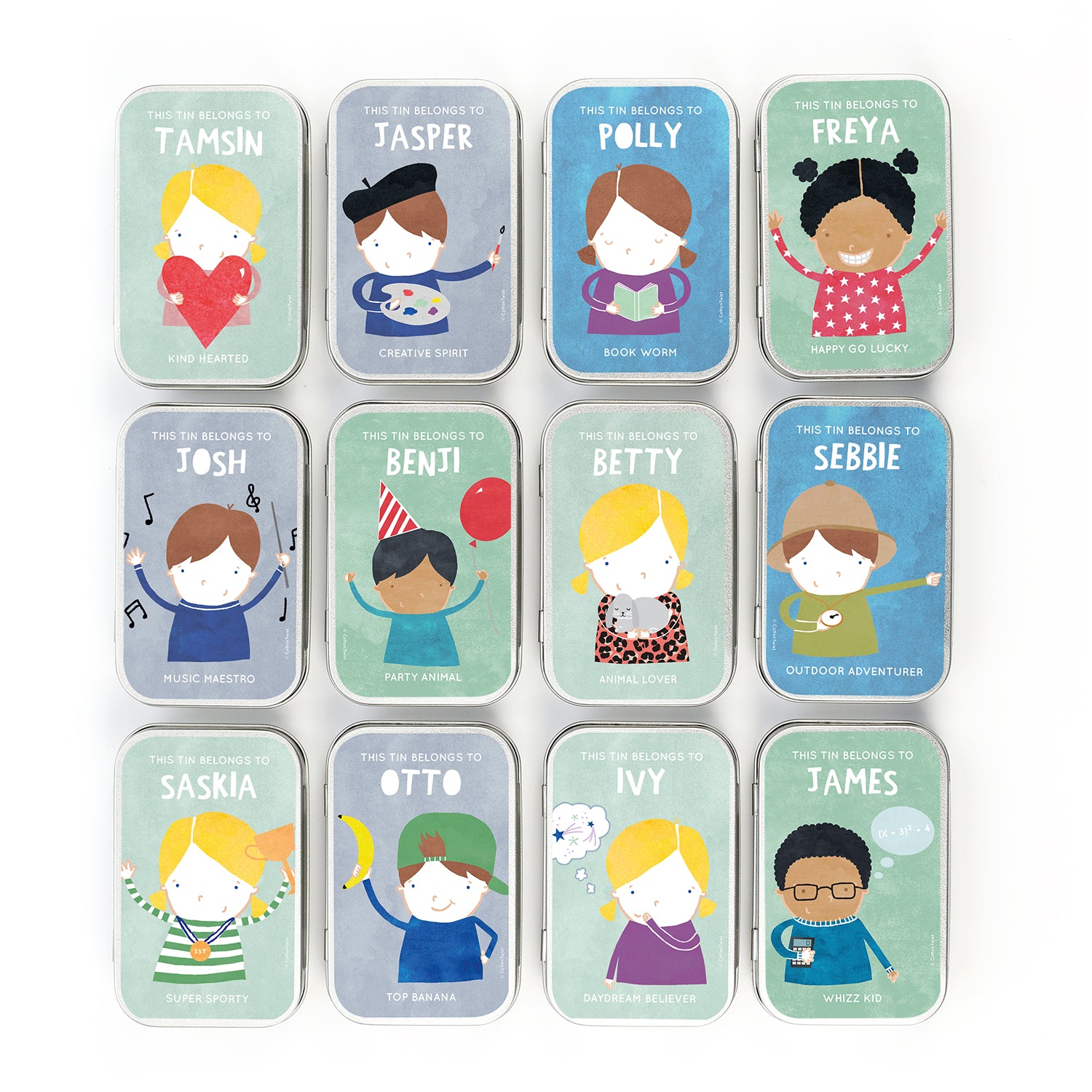 Personalised keepsake tins in twelve illustrated character themes. Match the most appropriate theme to the person in question. Are they kind hearted, super sporty, a creative spirit, or even a top banana?