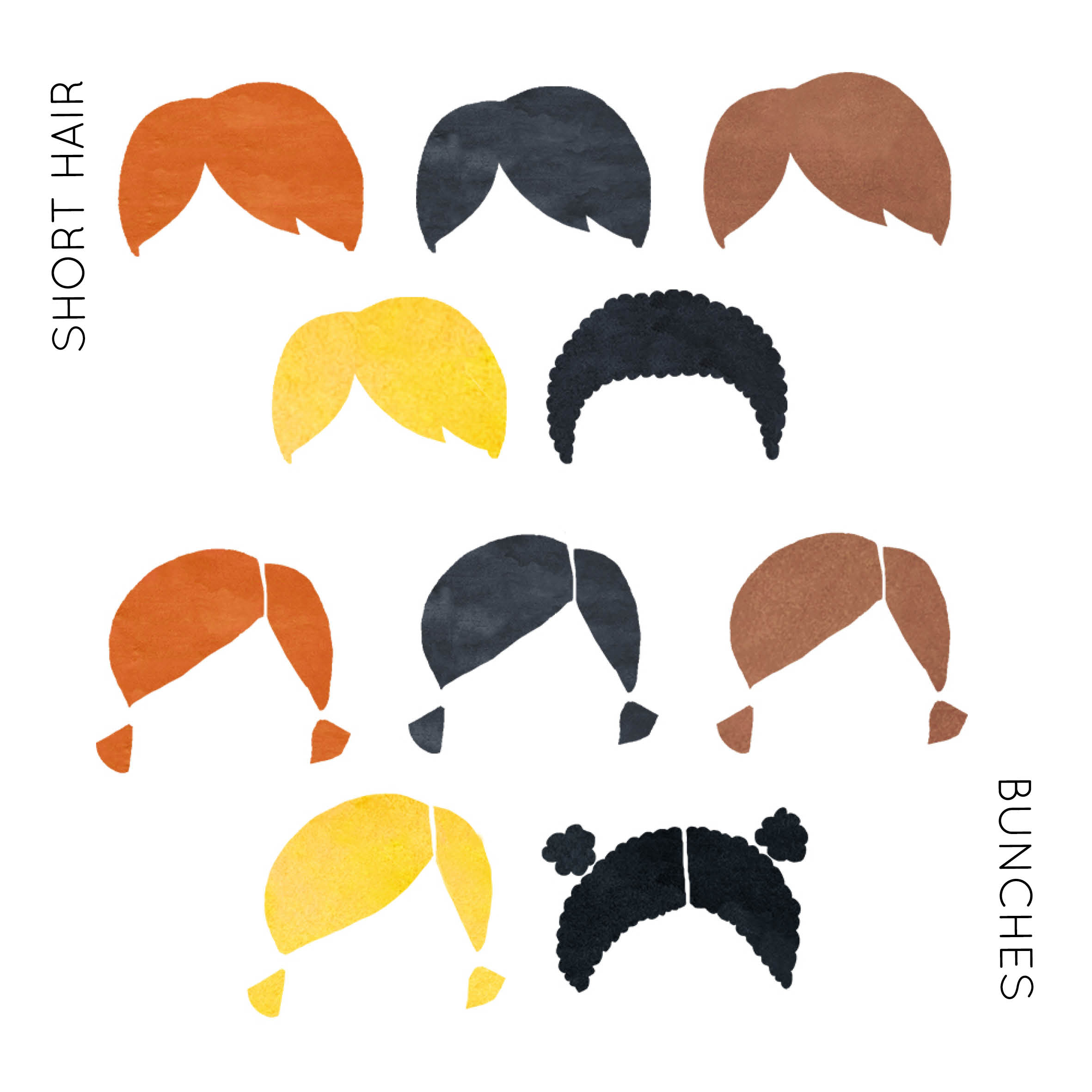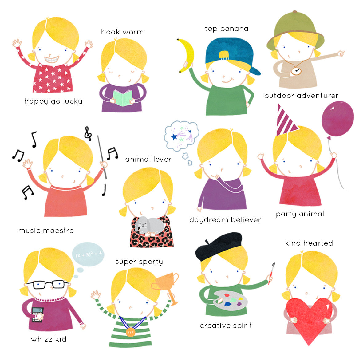 The design can be printed in one of the twelve illustrations, together with your choice of name, hairstyle (short or bunches) & hair colour.