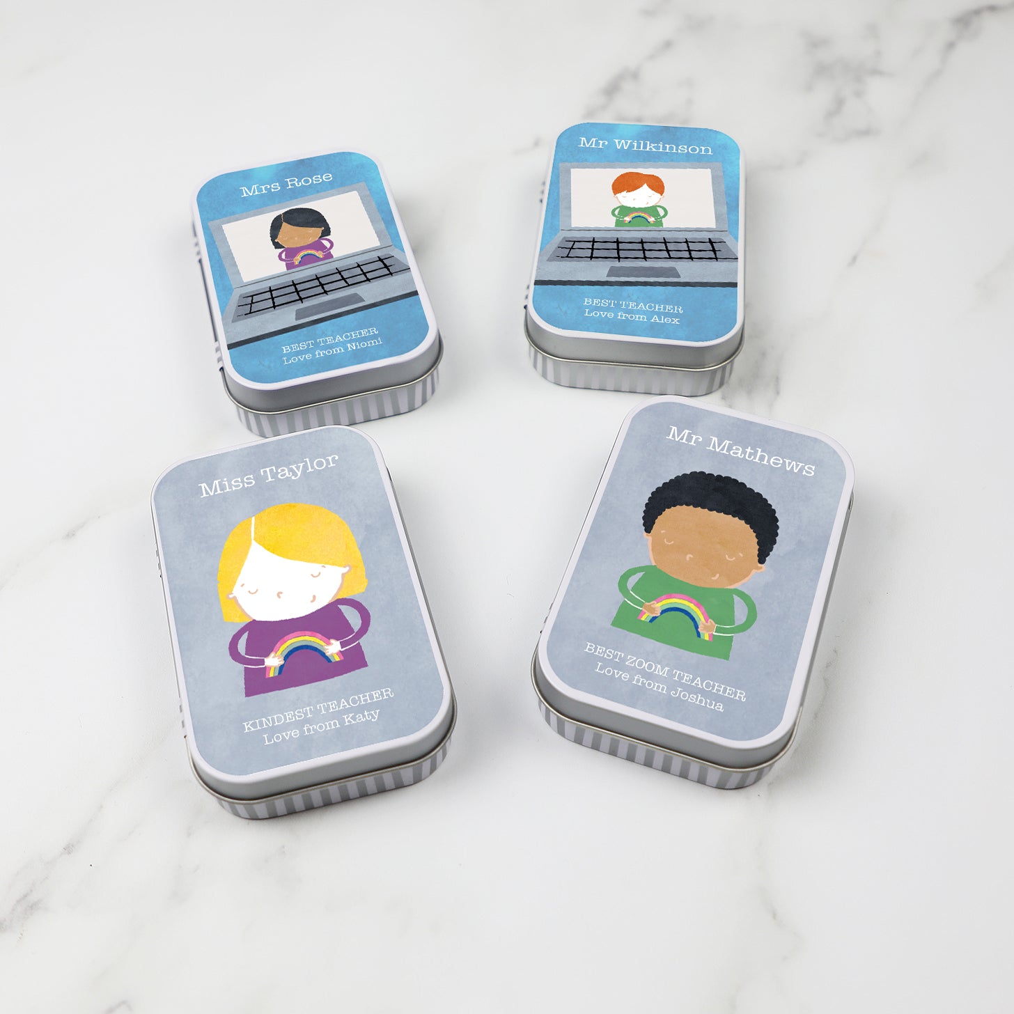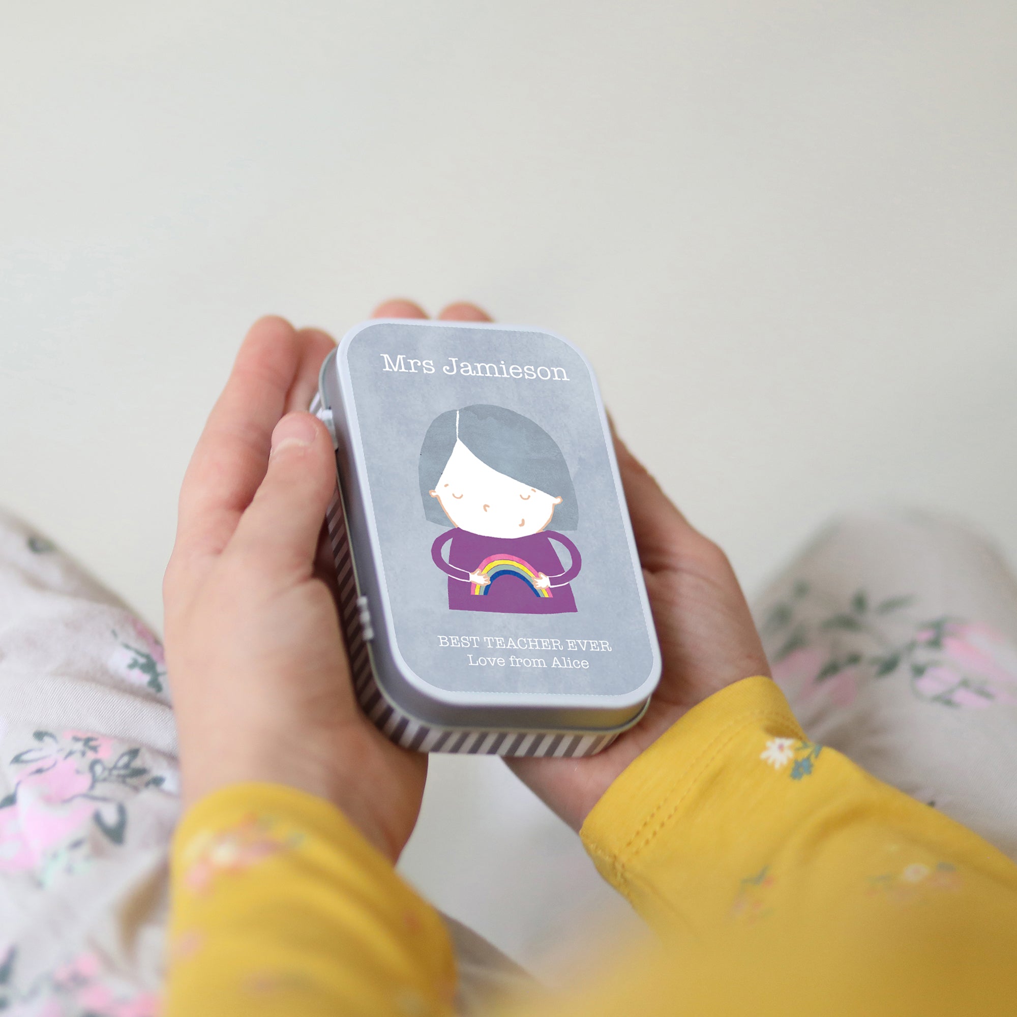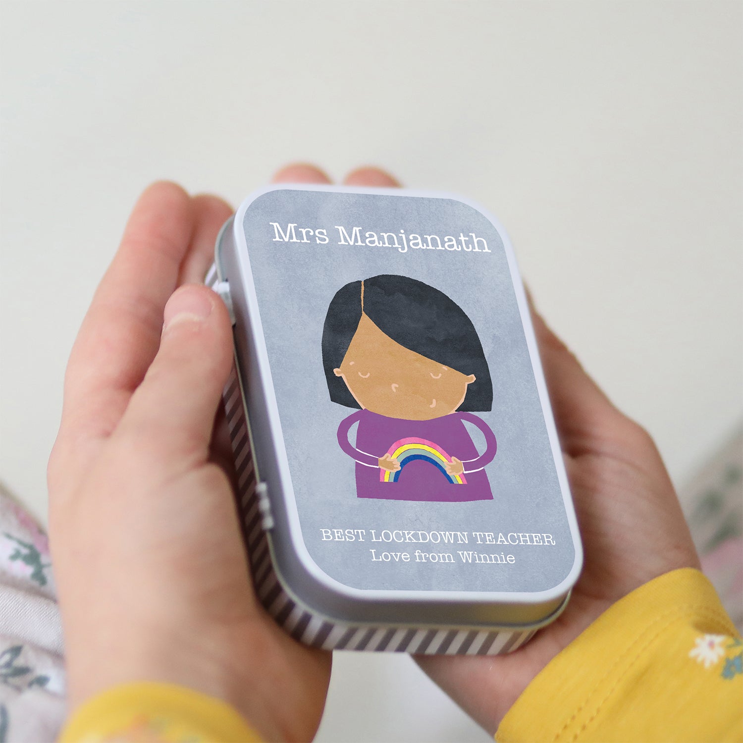 This Lockdown edition of the personalised teacher keepsake tin comes in four illustrated themes & has been designed to mark the momentous efforts teachers have made throughout the year. Has your child been in school, or have they received live lessons online? Each teacher is holding a rainbow to demonstrate their patience, attention & care. A lovely gift to thank the teachers in your lives. This personalised tin is a perfect little hideaway for a teacher's stickers, stamps, or treats.