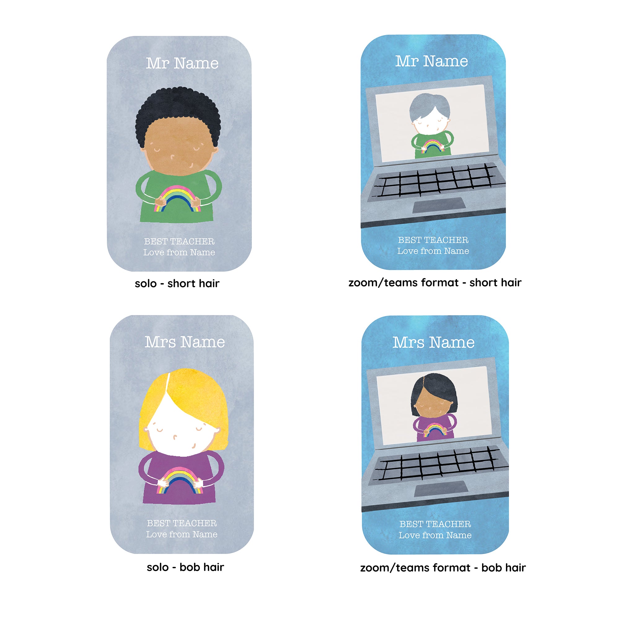 This product can be printed in one of the two illustrations together with your choice of name, message, hairstyle & hair colour . Options to choose from are a teacher holding a rainbow or teacher on a laptop screen.