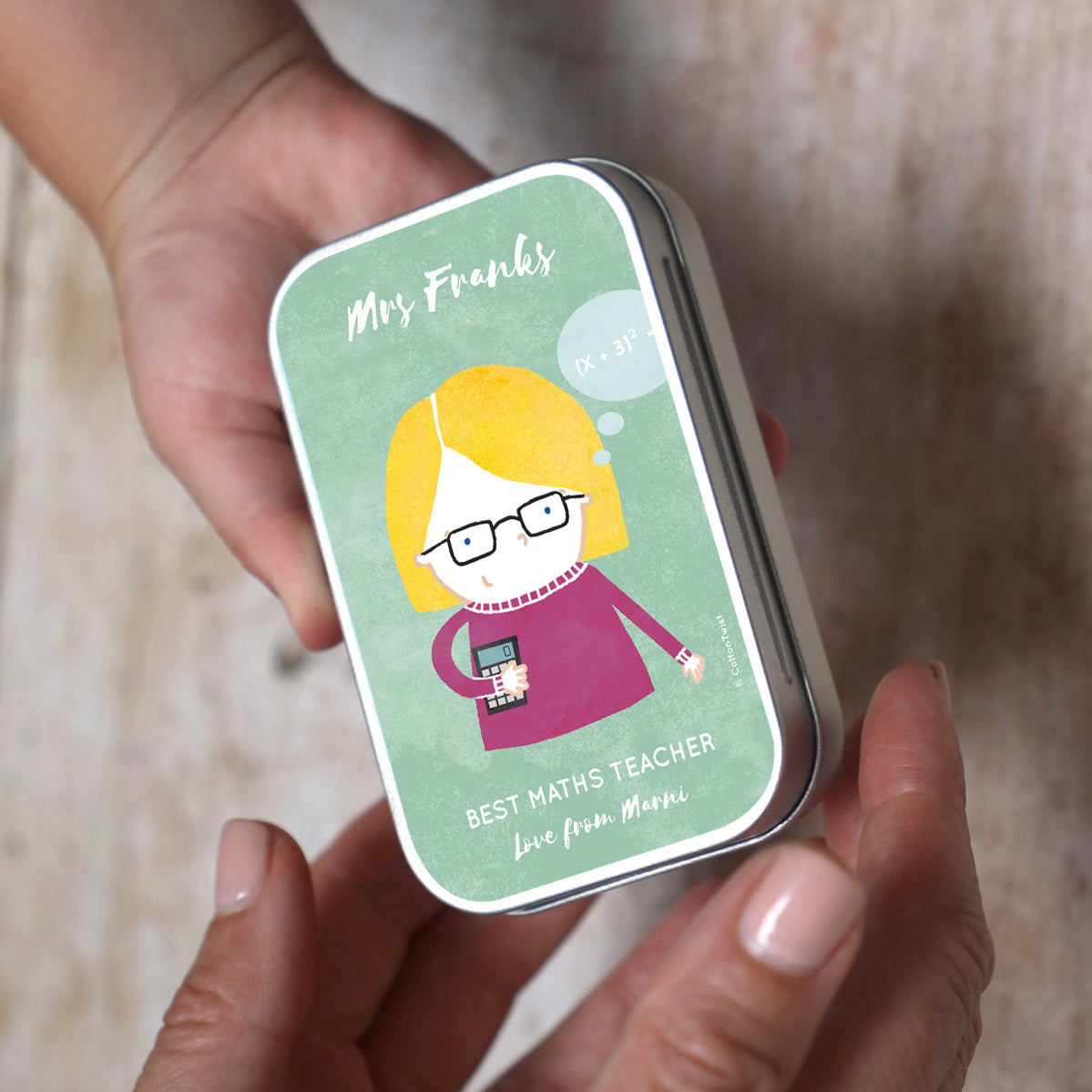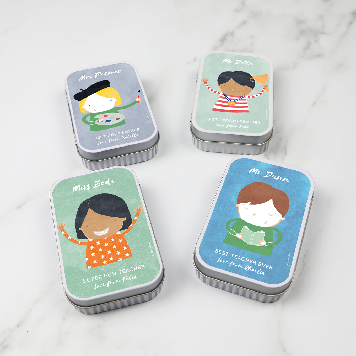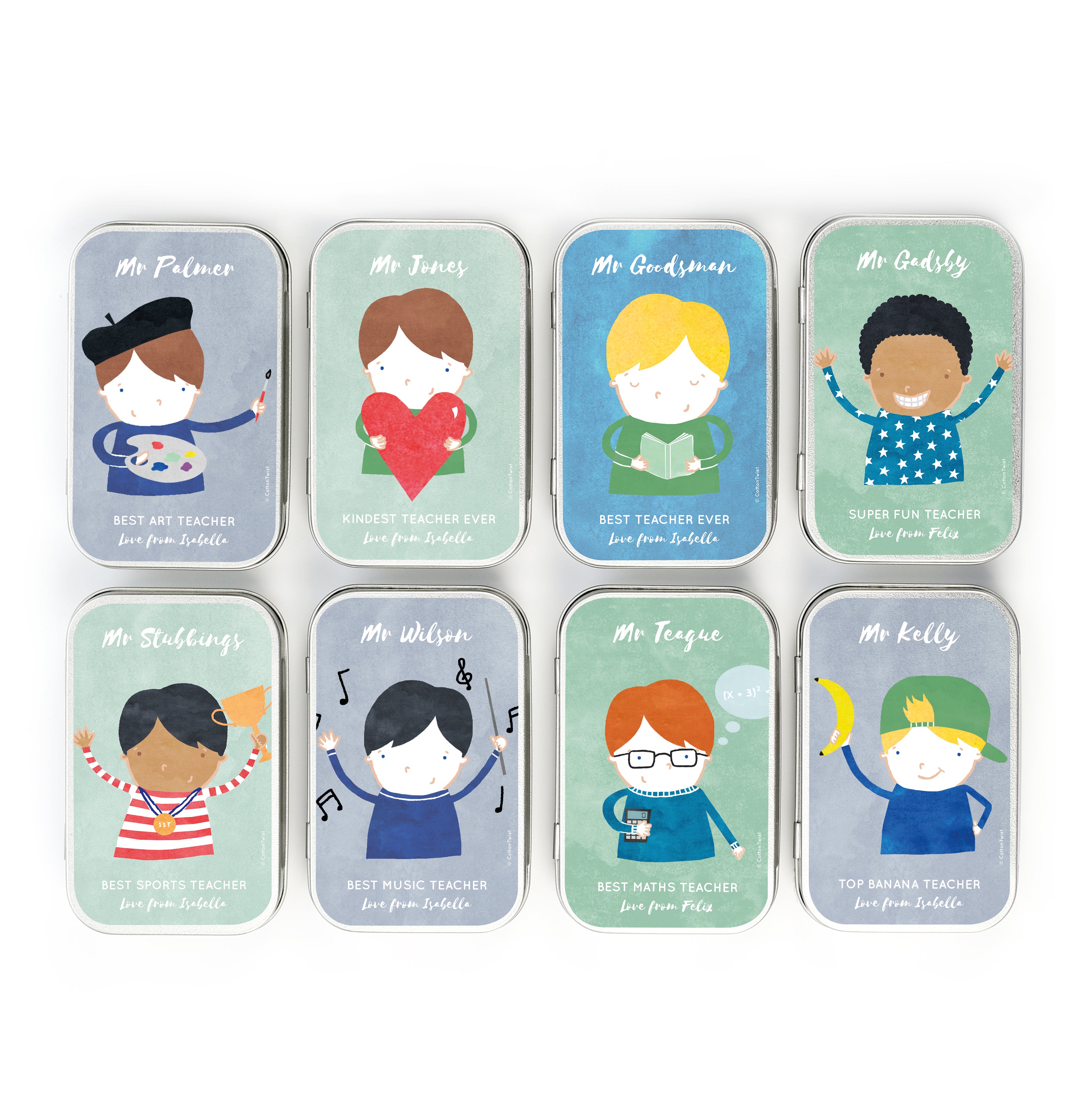 Personalised teacher keepsake tins in eight illustrated character themes. Match the most appropriate theme to the teacher in question. Are they the kindest teacher ever, super fun, or are they best maths teacher ever?