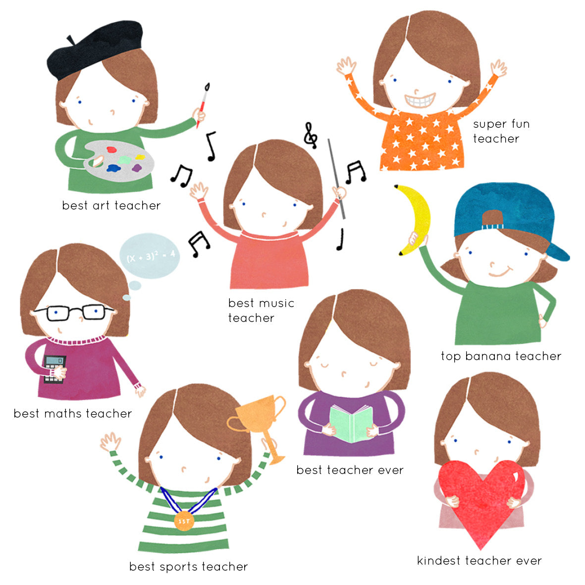 ** Please note the 'Best Maths Teacher' illustration comes with glasses as standard.