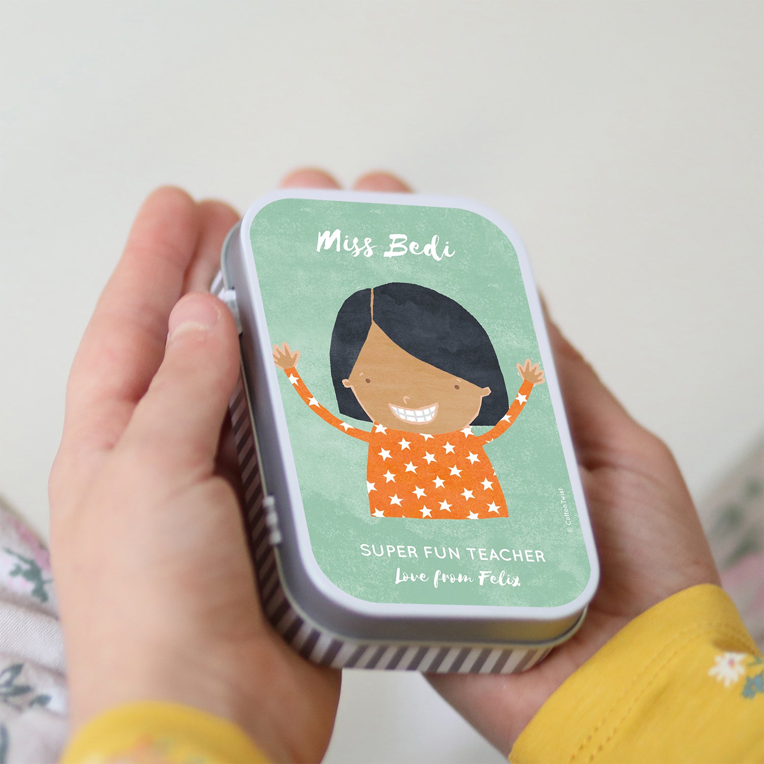 A lovely gift for to thank the teachers in your lives. This personalised tin is a perfect little hideaway for a teacher's stickers, stamps, or treats.
