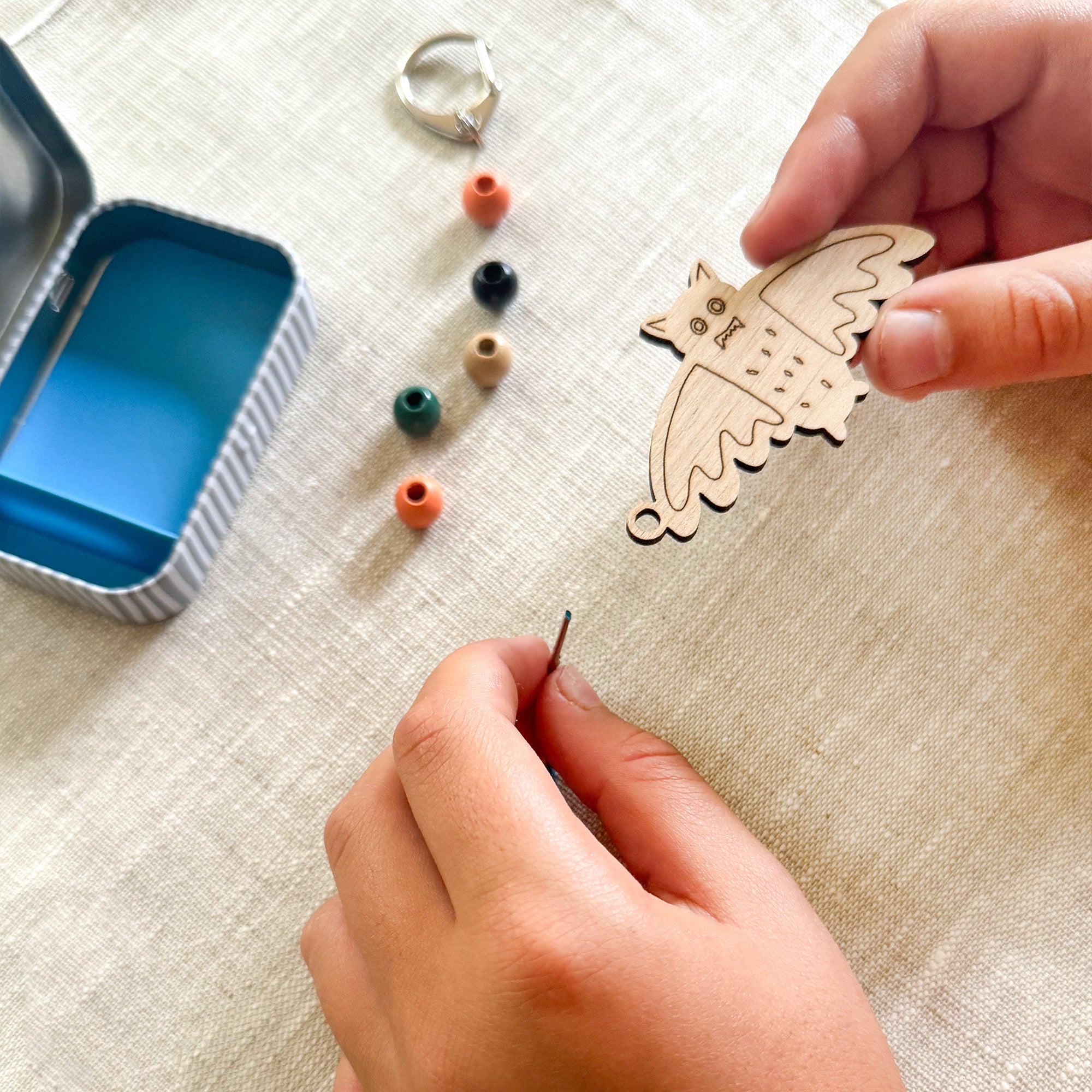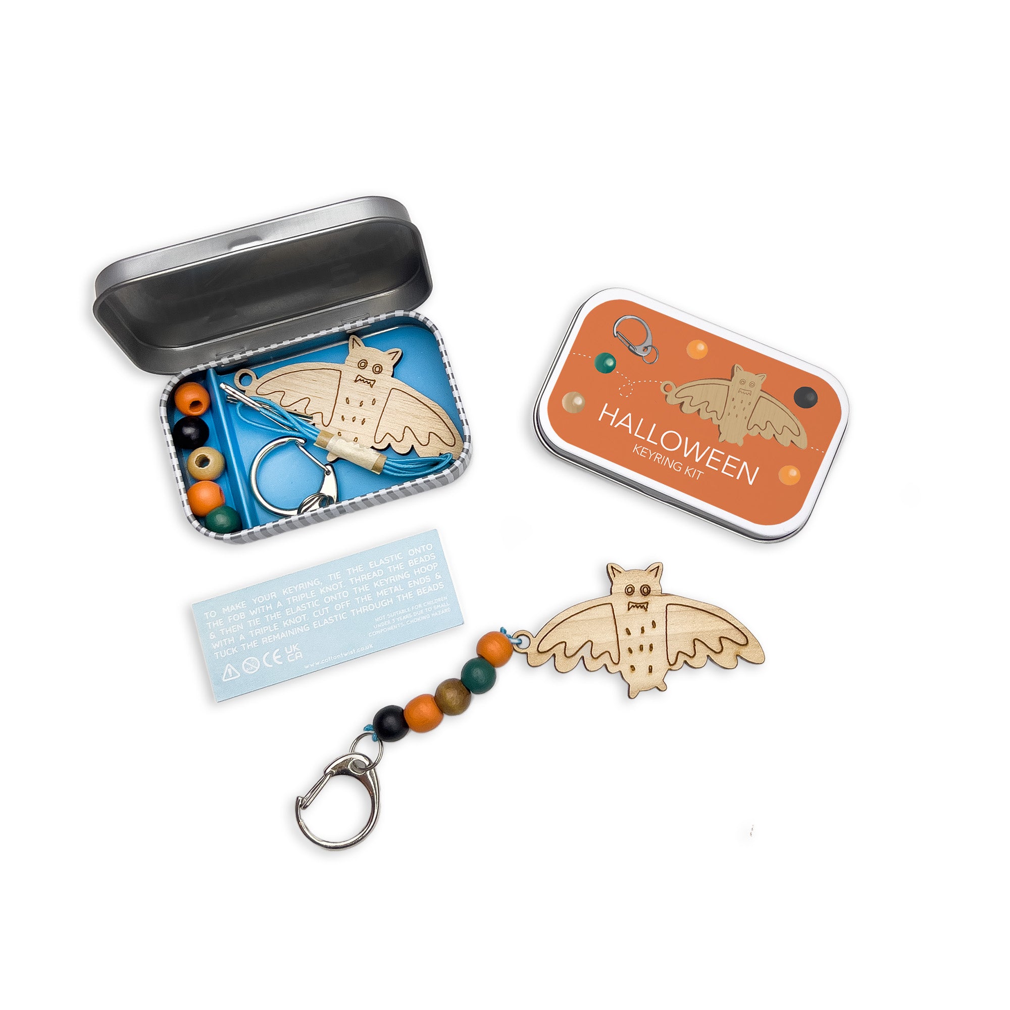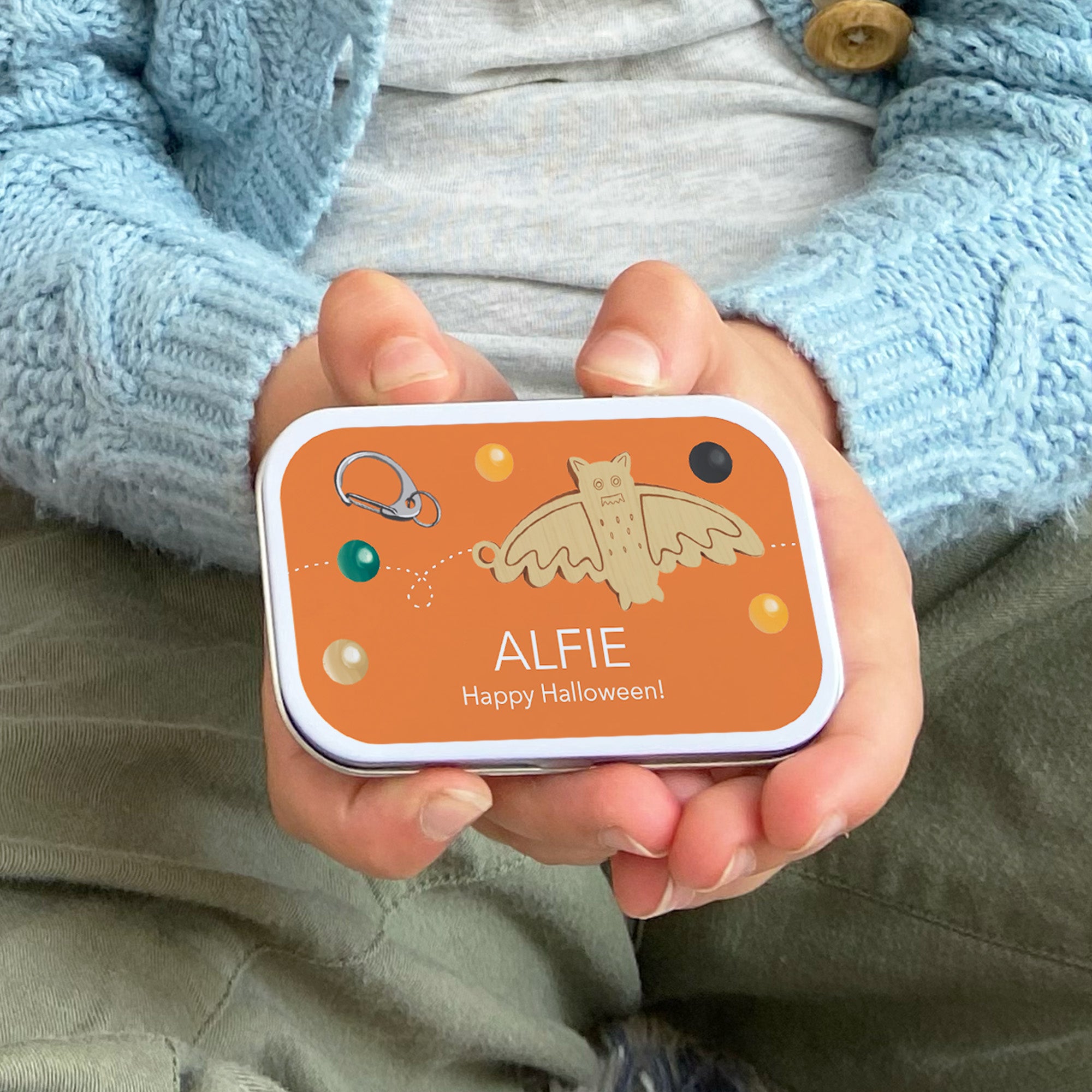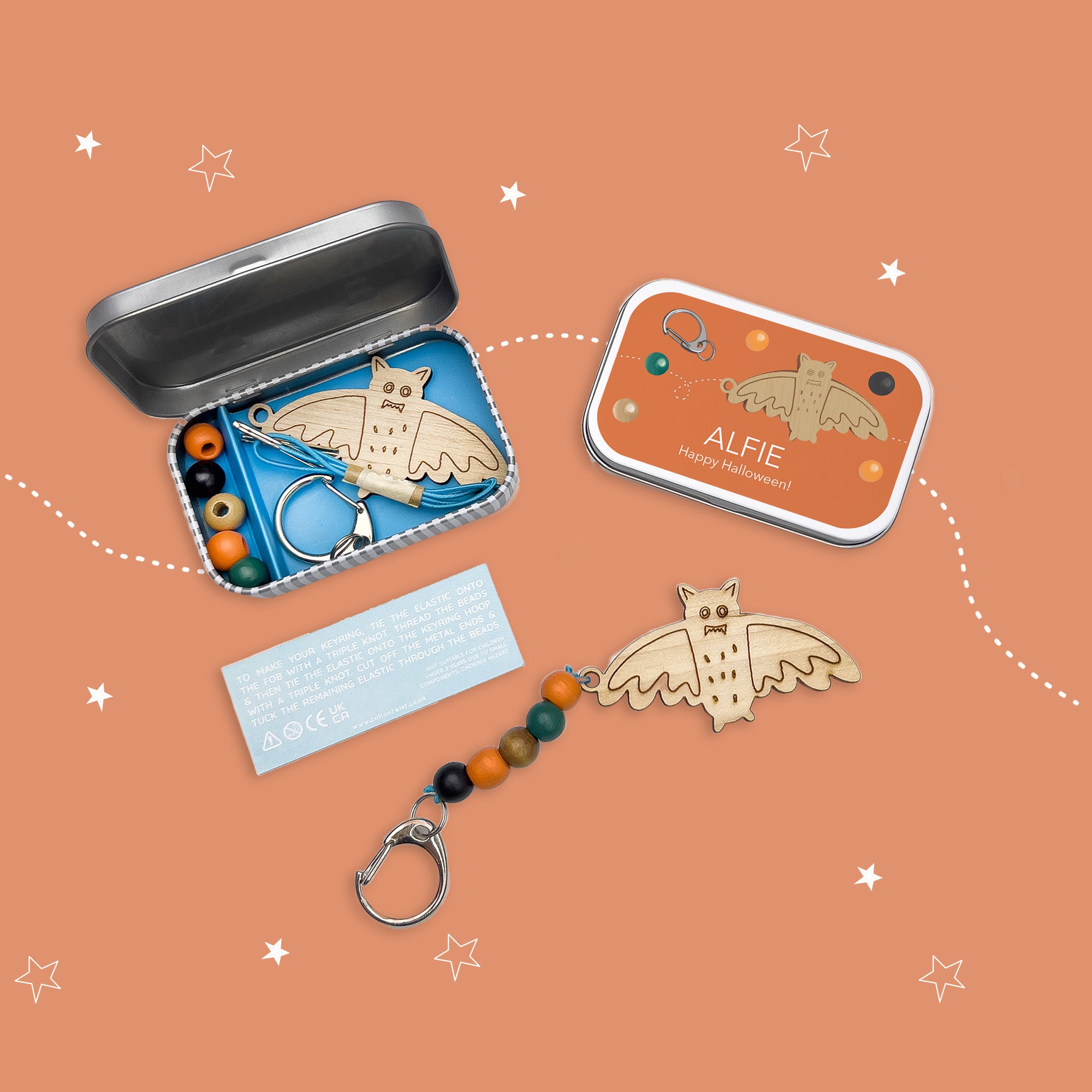 A personalised gift tin to create a Halloween inspired bat keyring. A great little keepsake for spooky autumnal vibes. Each tin contains a wooden bat, elastic & beads to create the keyring. The elastic comes with a hard end to aid the beading process for young children. Then, patience & precision are all that's required to assemble this piece.