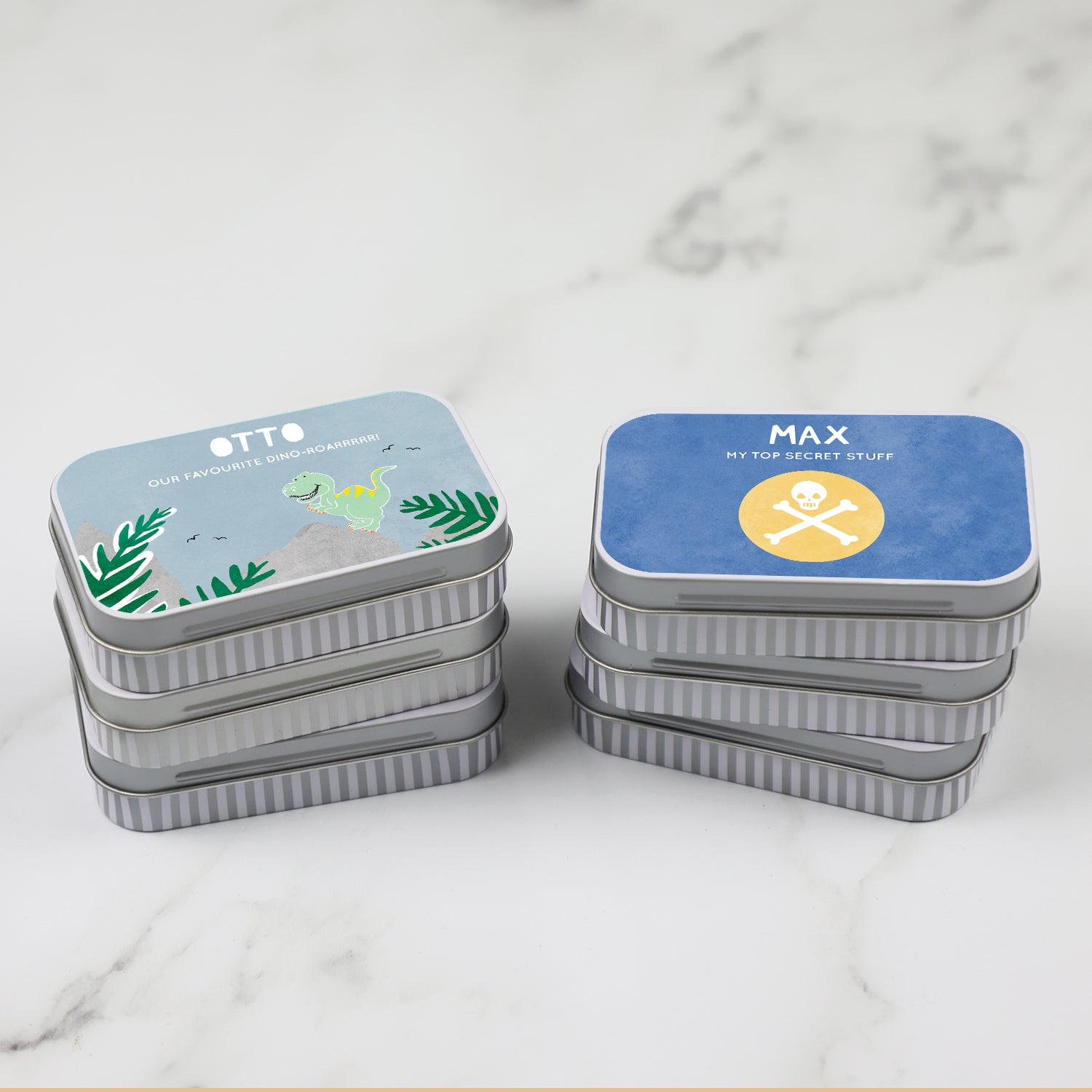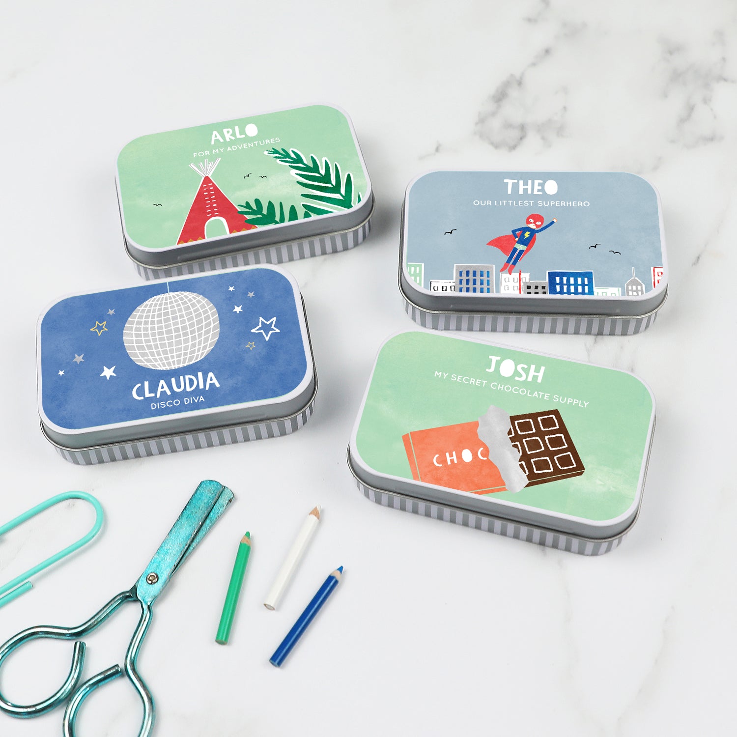 Personalised keepsake tins in 8 illustrated themes - perfect for children to stash their treasures in.