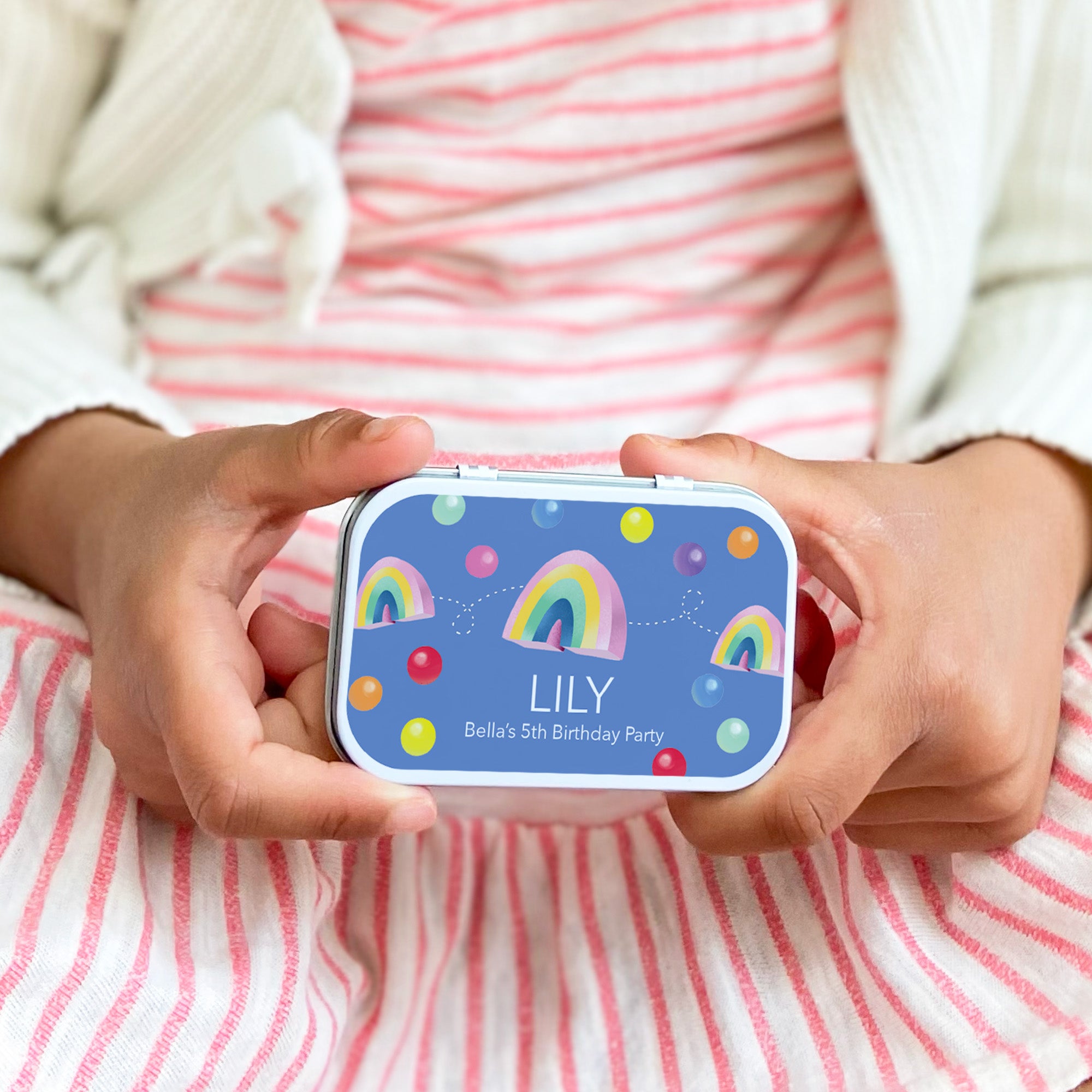 A beautiful personalised gift tin containing elastic & beads to create this rainbow bracelet. The elastic comes with hard ends to aid the beading process for young children. Then, patience & precision are all that's required to assemble this piece.