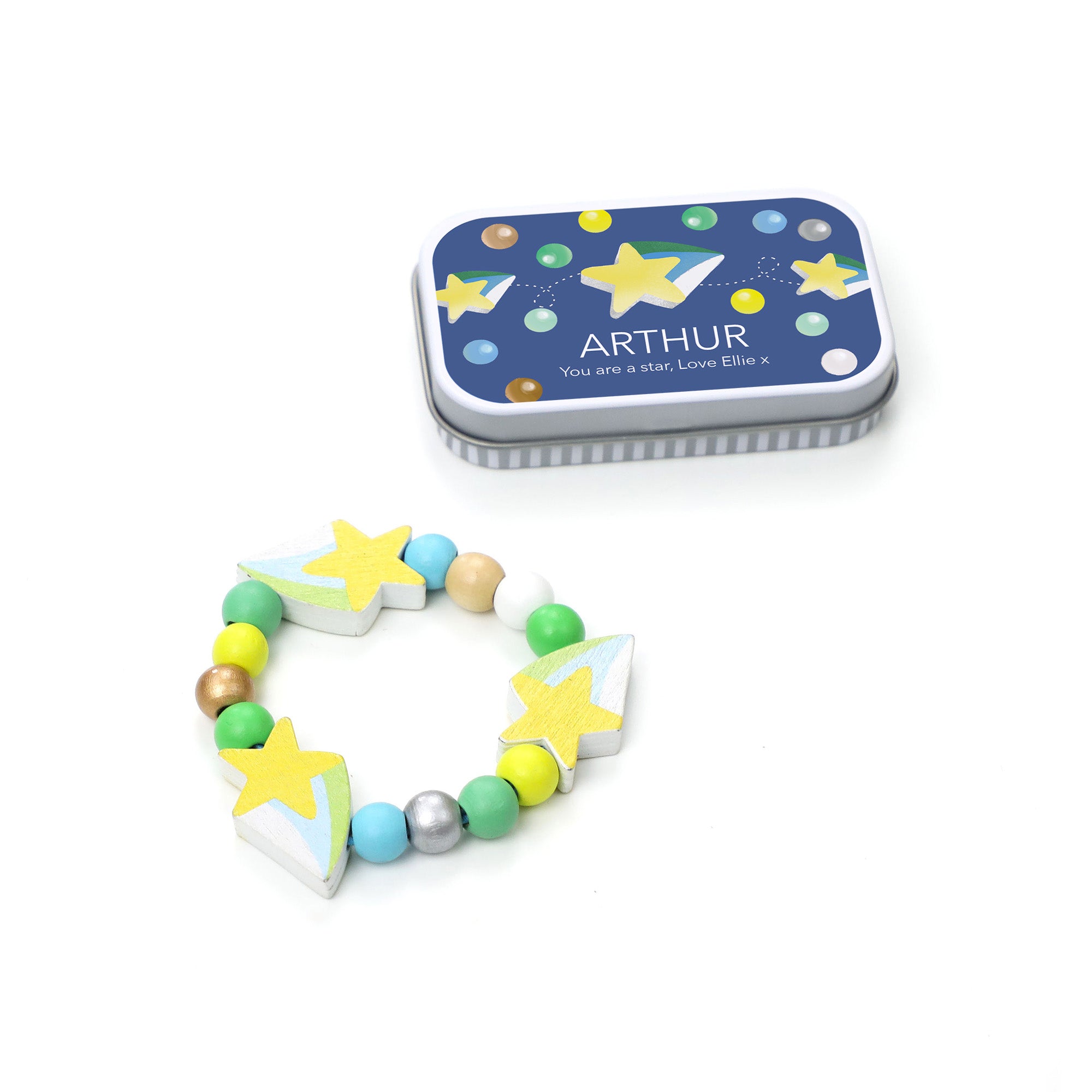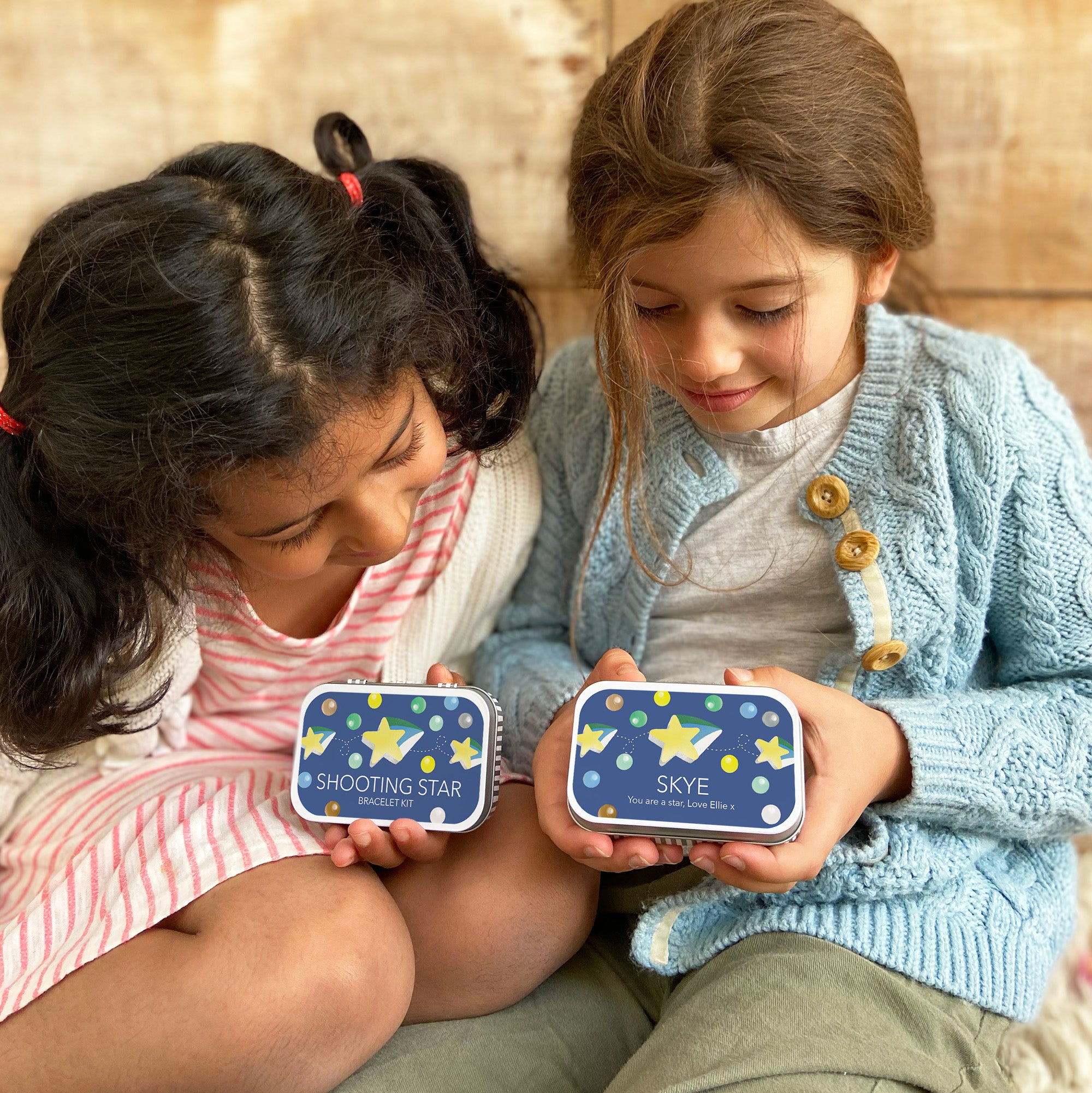 A personalised gift tin containing elastic & beads to create this shooting star bracelet. The elastic comes with hard ends to aid the beading process for young children. Then, patience & precision are all that's required to assemble this piece.