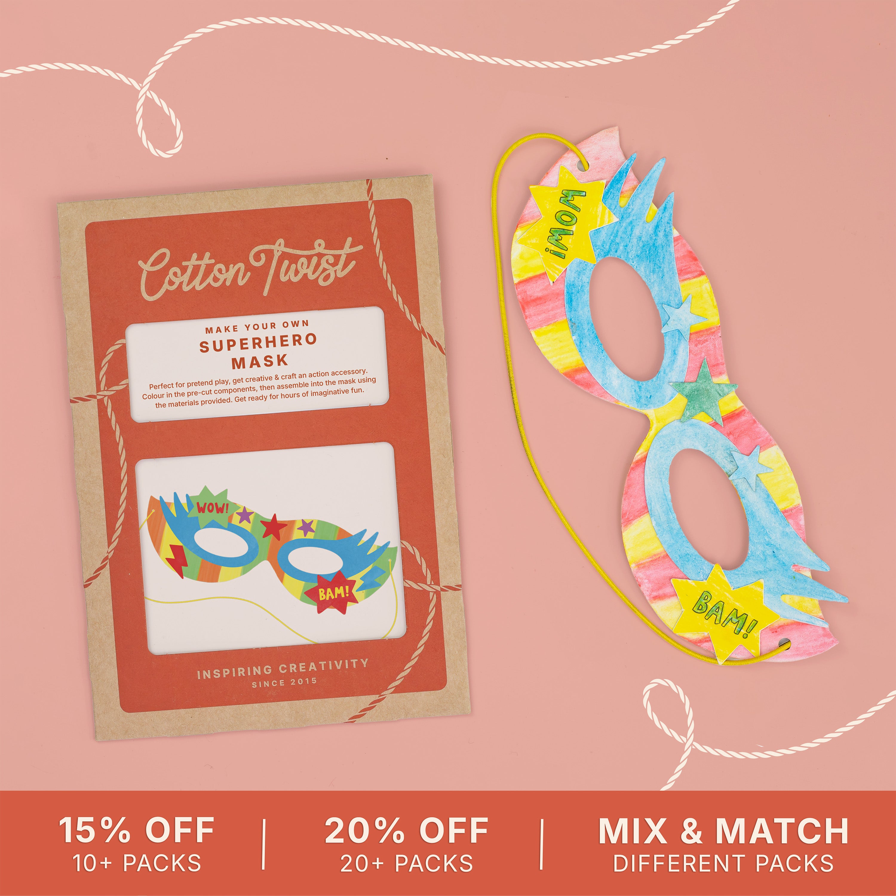 Perfect for three years & upwards, this sustainable kit would be perfect for a Superhero Party. Cotton Twist craft activities are often gifted as party bags, birthday presents, stocking fillers or rainy day activities.