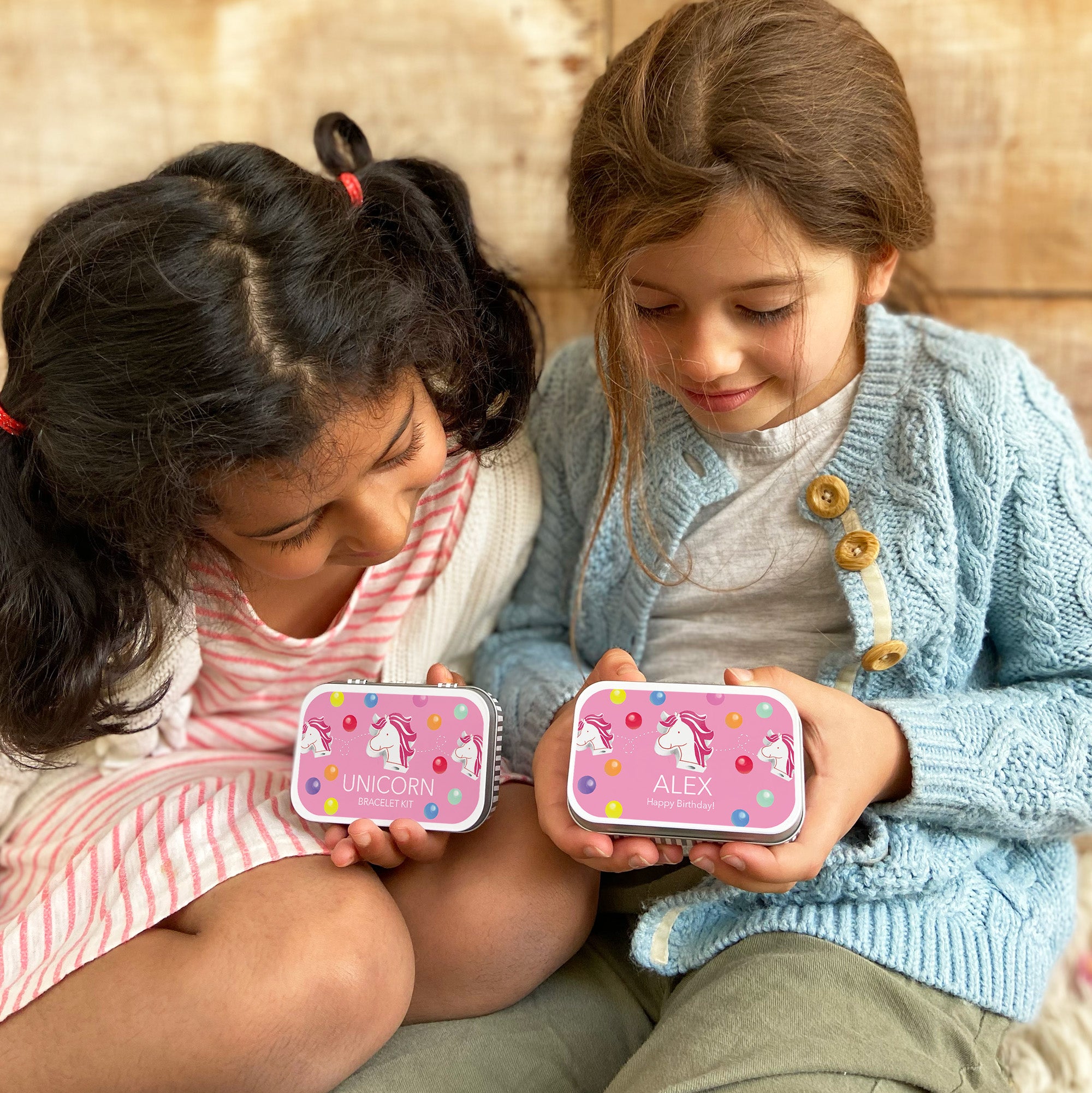 A beautiful personalised gift tin containing elastic & beads to create a unicorn bracelet. The elastic comes with hard ends to aid the beading process for young children. Then, patience & precision are all that's required to assemble this piece.